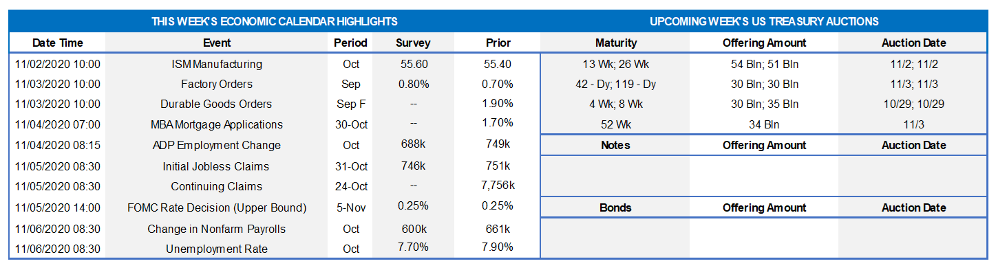 This week brings a reprieve in term UST auctions. Corporate issuance should add yet again to its historic record annual pace. Attention will remain on the elections, prospects of further relief legislation, the FOMC meeting, and certainly also on COVID-19 developments.