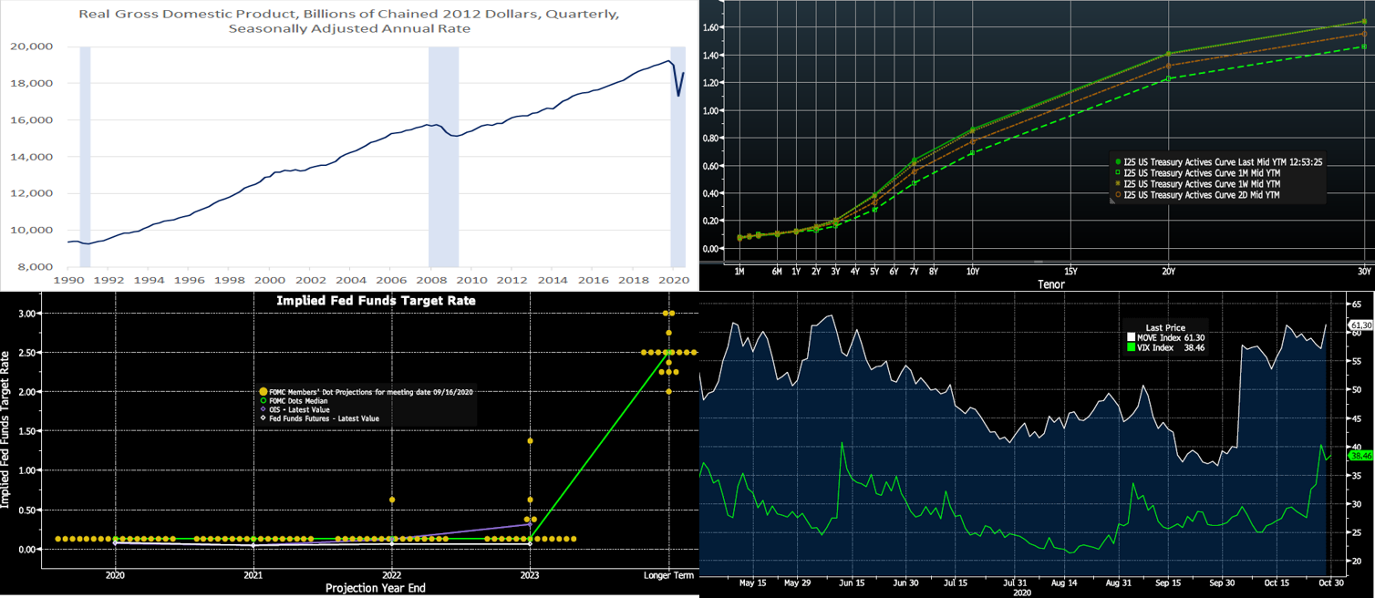 Source: Bloomberg. With the upcoming elections and heightened uncertainty, measures of market implied volatility in stocks and bonds have risen in recent weeks. Both the “VIX”, an index of implied volatility of the S&P 500, and the ”MOVE”, and index of implied volatility of UST’s, have clearly climbed higher. There are various potential scenarios and impacts on rates, most of which tend to influence the longer end of the yield curve; meanwhile, COVID-19 case numbers, infection and hospital rates, and total death counts have all risen in recent weeks. Please call the desk to discuss markets and potential scenarios for rates and the yield curve.