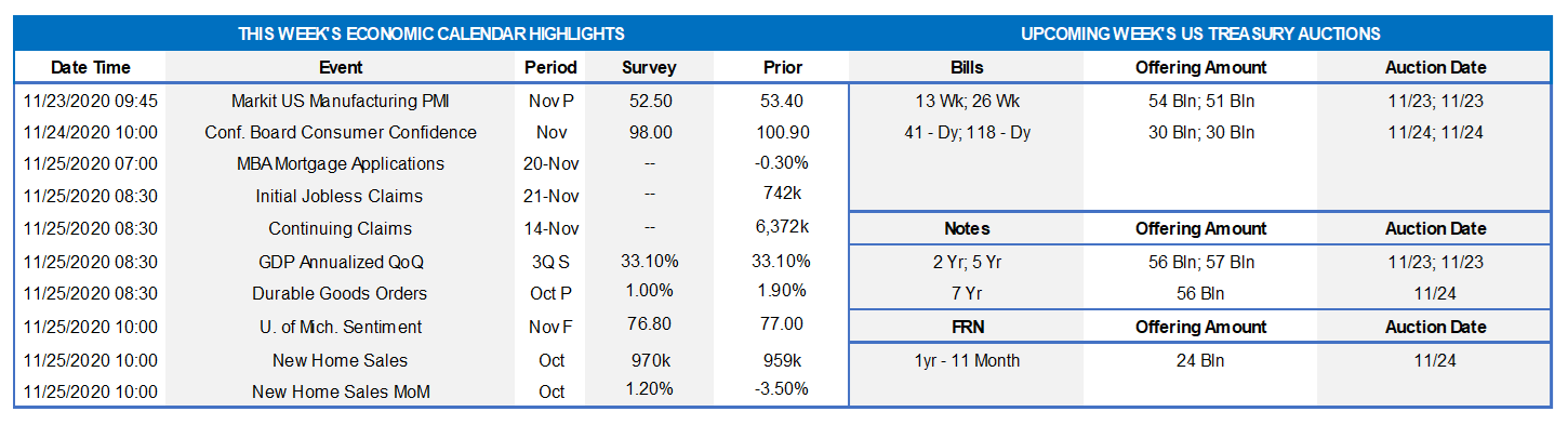 On the UST supply front, this week brings 2/5/7-year auctions in a short week. Corporate issuance should add yet again to its historic record annual pace albeit slower in the holiday week. Attention will remain on the prospect of further relief legislation and certainly also on COVID-19 developments which have been notably worsening. Happy Thanksgiving to our readers!