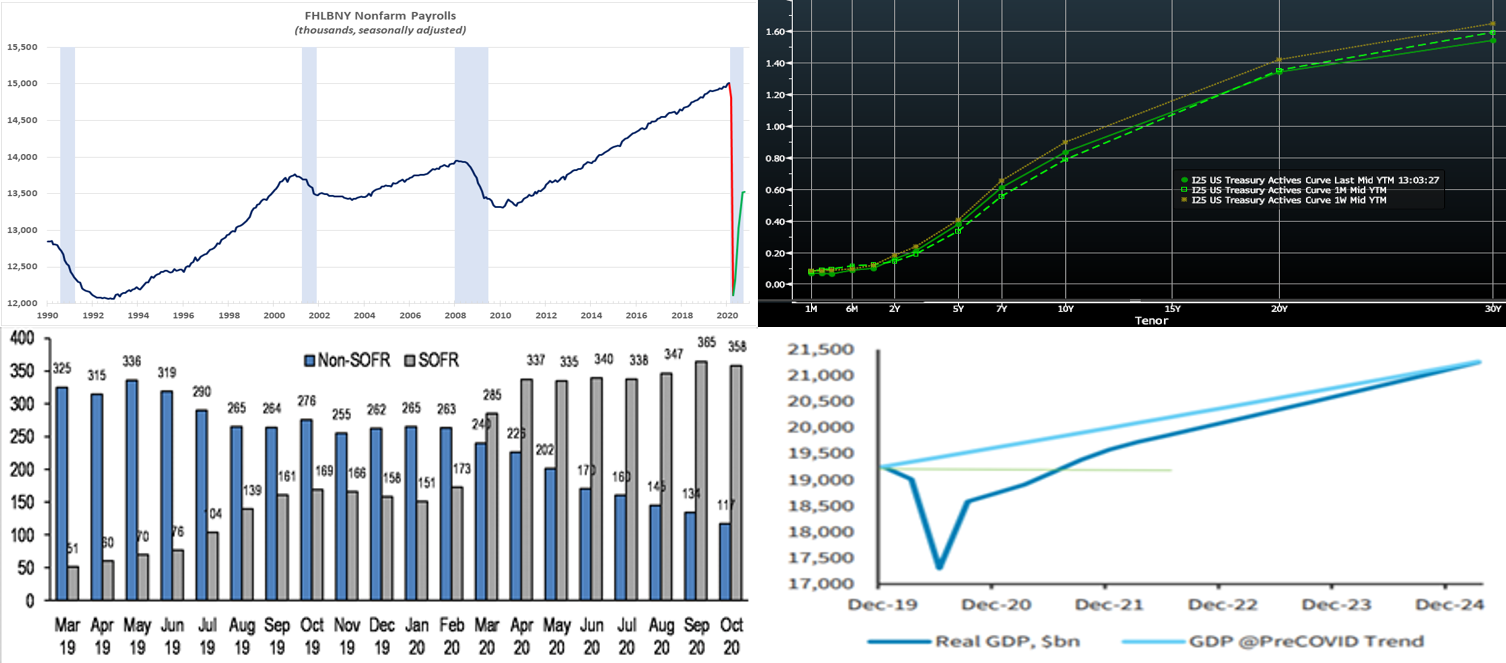 Heavy T-Bill issuance will remain a theme; UST issuance overall is now net positive supply in that more is being issued than what the Fed is buying in its programs, and so this scenario could prove a small challenge. However, with short UST rates at rock-bottom levels, and the Fed likely on hold for a long period, rates may trade in a sideways to slightly lower pattern. Net T-bill issuance has been lower since mid-summer and even negative in recent weeks, and Treasury has announced plans to shift issuance out the curve, but a new fiscal relief package could complicate/alter this forecast. Market sentiment thus far towards election outcomes is that the probability of very large fiscal legislation has been reduced, thereby leading to less T-bill supply.