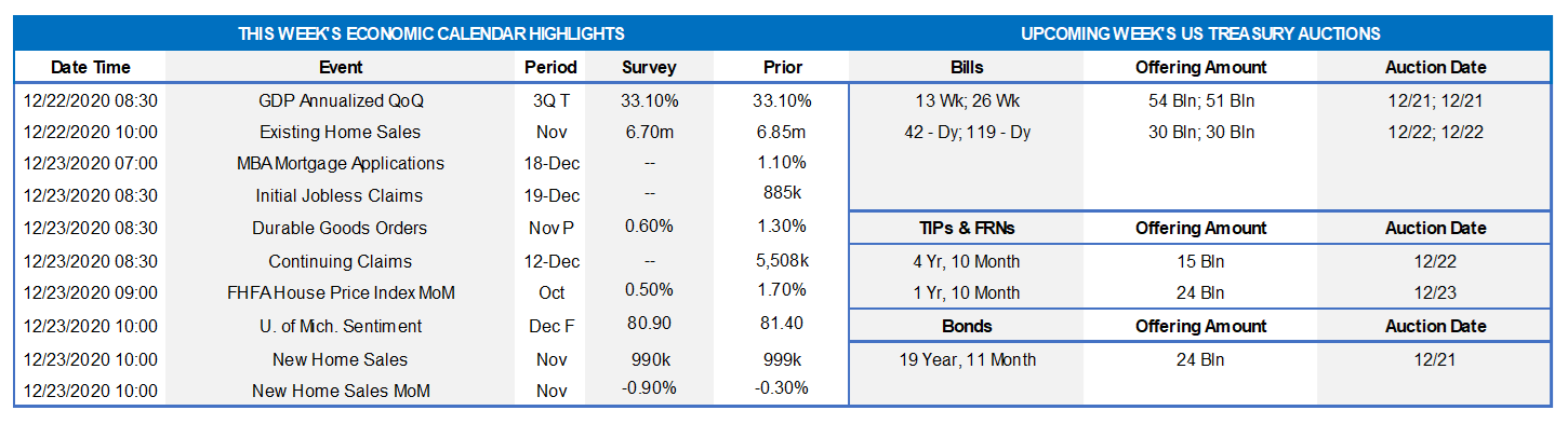 On the UST supply front, this holiday week is light in term space. Corporate issuance should dissipate from its historic record annual pace, given the impending holiday weeks. Attention will remain on the prospect of further relief legislation and certainly also on COVID-19 developments.