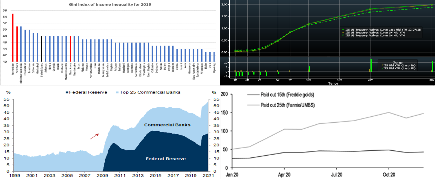 CHART 1 – UPPER LEFTSource: U.S. Census Bureau, FHLB-NY. Income inequality varies across the U.S. and FHLB-NY district. The Gini Index is a measure of the distribution of income across a population, developed by the Italian statistician Corrado Gini in 1912. A value of 0 indicates perfect equality, while a value of 100 indicates perfect inequality. It is often used as a gauge of economic inequality, measuring income distribution or, less commonly, wealth distribution among a population. The latest data available for 2019 reveal that income inequality was widest in Puerto Rico, followed by New York State. New Jersey’s reading was in line with the nationwide average. The pandemic of this past year has certainly spurred greater inequality, and the Fed has invoked this condition as a source of concern/focus and a reason to “stay the course” on rates and asset purchases.