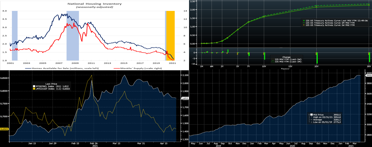 Source: Bloomberg. A contributor to the retracement of yields has been real-money investors, such as banks, buying of securities. Depicted here is the holdings (in $bn) of UST and Agency-issued securities by US commercial banks. These holdings have maintained a notable uptrend and sit near $3.96trn, driven by high liquidity levels and thus-far tepid loan demand in the nascent recovery. Many institutions expect loan demand to accelerate in the second half of the year, and funds are being put to work in the meantime.