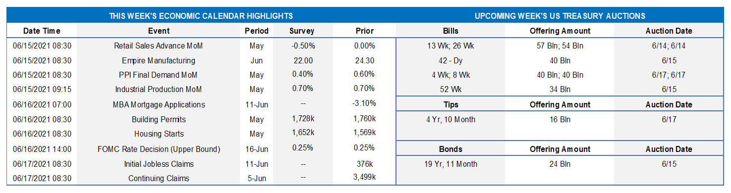 - On the UST supply front, this week holds a 5-year TIPS and a 20-year nominal auction. There has been strong investor demand for recent auctions. The market will apply close attention to this week’s FOMC meeting for any changes in guidance on rates and asset-purchases.