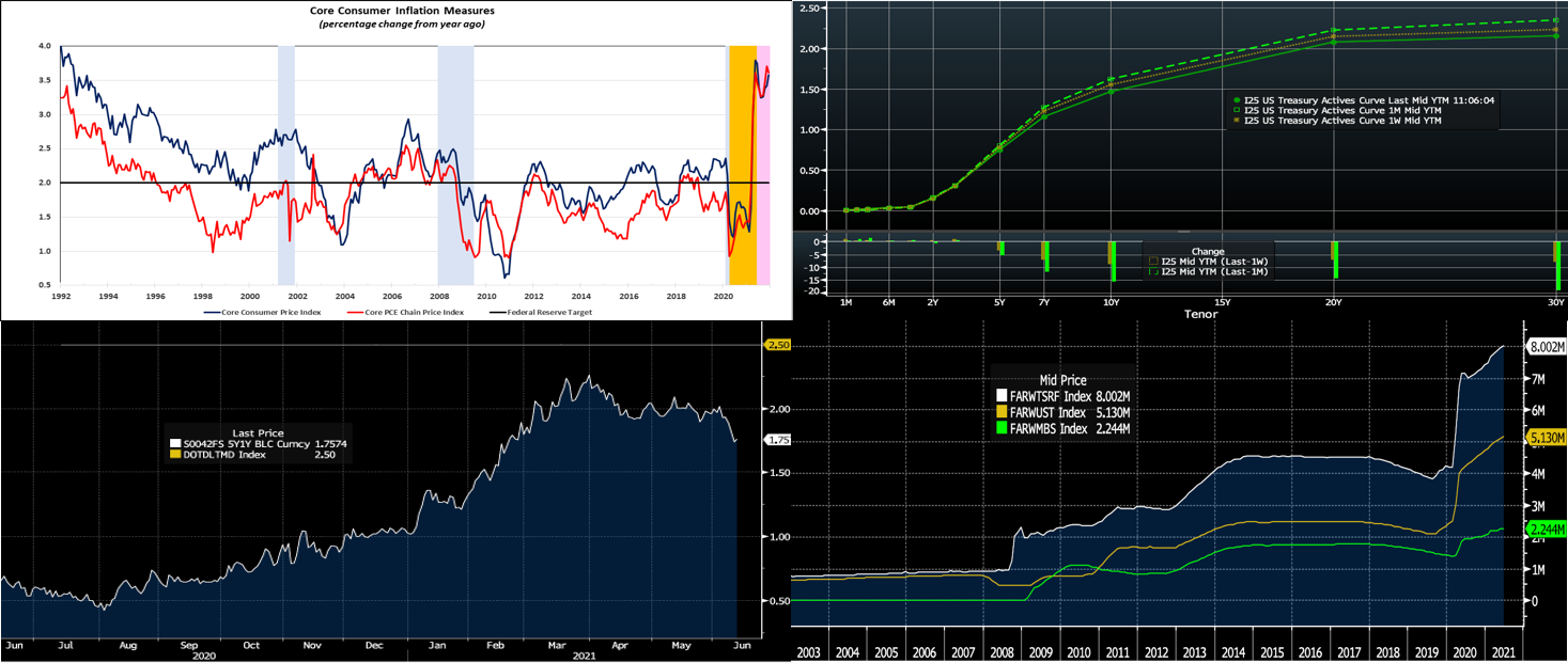 Source: Bloomberg. Depicted here is the 1-year, 5-year Forward Overnight Index Swap (RHS, white, %), a proxy for Fed Funds curve, vs. the Fed’s longer-run projection of the Fed Funds rate (RHS, gold, %) from its “Dot plot”. Given the latter is 2.5%, current OIS curve pricing at ~1.75% is well below that level. From this perspective, and as/if data portrays further economic recovery, the belly of the yield curve would seem vulnerable to a backup in yields. For those in need of a hedge to higher term rates, current levels are certainly more attractive than a few weeks ago; note that our Symmetrical Advance special (see details on last slide) runs through June 30th.