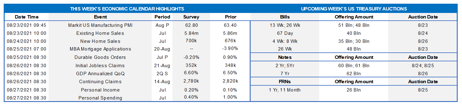 On the UST supply front, this week brings 2/5/7-year auctions. The market will monitor economic data and especially the Jackson Hole symposium for any Fed officials’ pronouncements regarding the taper of bond purchases.