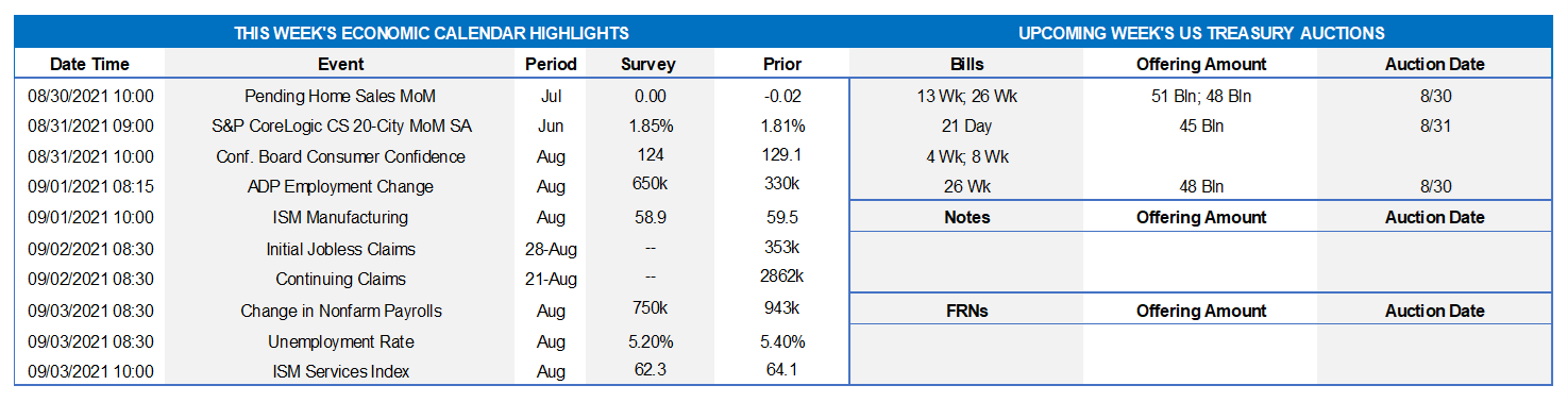 On the UST supply front, this week brings a reprieve in auctions. Per the color on the previous section, corporate issuance may accelerate this week, although the real surge is more likely to be post-Labor Day. The market will monitor economic data and any additional Fed officials’ pronouncements regarding the taper of bond purchases.