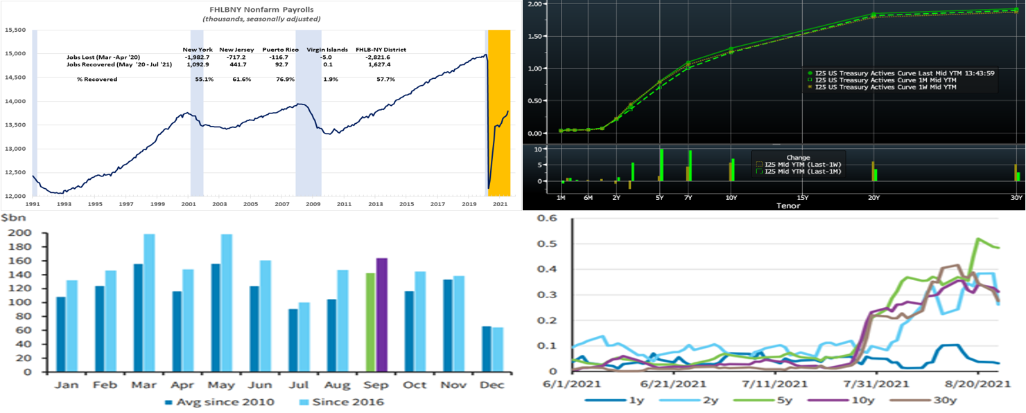 Source: DTCC SDR; Barclays Research. Depicted here is the ratio (LHS, 5-day rolling average of new trades), over the last few months, of aggregate SOFR swap notional to that of Libor swap notional. As covered in our July 30th edition, on July 26th the derivatives market adopted a “SOFR First” initiative for inter-dealer trades to encourage increased volumes. SOFR First is part of a series of developments in the transition to SOFR and has been welcomed/endorsed by relevant regulatory bodies and Reference Rate working groups. The upward momentum of SOFR trades has been sustained over the past month, with the 5-year tenor hovering near 50% and serving as the standout. Members are encouraged to explore our SOFR product suite (https://www.fhlbny.com/business-lines/credit-products/sofr-arc) and to contact the desk with any questions and/or feedback.
