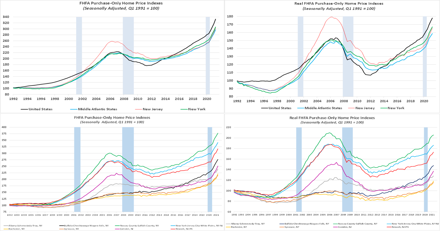 Solid demand amidst historically low inventory levels continues to propel home prices sharply higher across the country and within the FHLB-NY district. Indeed, during Q2, the average nominal cost of a home nationwide stood 48.8% above its pre-Great Recession peak, with those in New York and New Jersey changing hands at 40.6% and 17.4% above their respective levels at that time.