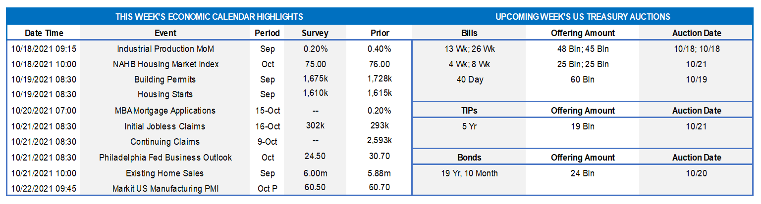 Source: Bloomberg. Note: Top pane is yield (%), bottom pane is change (bps). As of midday Friday of a holiday-shortened week, the UST curve was notably flatter week-over-week, as yields 5-year-and-in rose, but those in the longer end declined. For instance, the 2-year was ~6 bps higher and 5-year was ~4 bps higher, whereas the 10-year moved ~5bps lower and 30-year ~12bps lower. The move in the longer end was impressive, given that there were UST auctions in both maturities during the week; both auctions witnessed strong demand. Economic data during the week was generally positive. But the mid-week CPI release was above consensus expectations. The curve flattening appears to be driven by the market ‘s belief that the Fed will counter and contain the longer-term inflation threat via a taper announcement in the next two months and thereby “kick off” a removal of accommodation and application of rate hikes later next year.