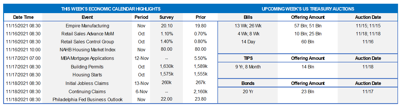 - On the UST supply front, this week will bring 20yr Bonds and 10yr TIPs. As always, the market will closely monitor this week’s legislative developments and economic data.