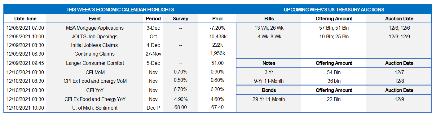 Source: Bloomberg. Note: Top pane is yield (%), bottom pane is change (bps). Since our pre-holiday edition two weeks ago, UST yields have traded in volatile fashion but with an overall flattening trend. Renewed pandemic concerns, driven partly by the new Omicron variant, have contributed to the move lower in longer-end yields. Shorter-end yields out to 3-year are higher over the period, as the market has firmly priced Fed rate hikes into the curve. With the January 2023 Fed Funds future trading at .69%, the curve currently prices for slightly under 2.5 Fed hikes by the end of 2022. The expectation for the Fed to potentially taper faster and hike sooner, and thereby squelch inflation, has helped the notable decline in 5-year-and-out yields. Breakeven inflation rates on TIPS reflect this theme, as they are notably lower from mid-November. The market’s recent higher intraday volatility may present opportunities to borrow advances at more advantageous rates. Please engage with the desk to monitor rate levels. Meanwhile, on the asset side, higher implied volatility in market-pricing can offer an opportunity (higher implied volatility increases a security’s yield, all else equal) to consider callable and MBS purchases. As the market eagerly awaits the December 14-15 FOMC, the highlight this coming week should be the CPI data as well as pandemic developments.