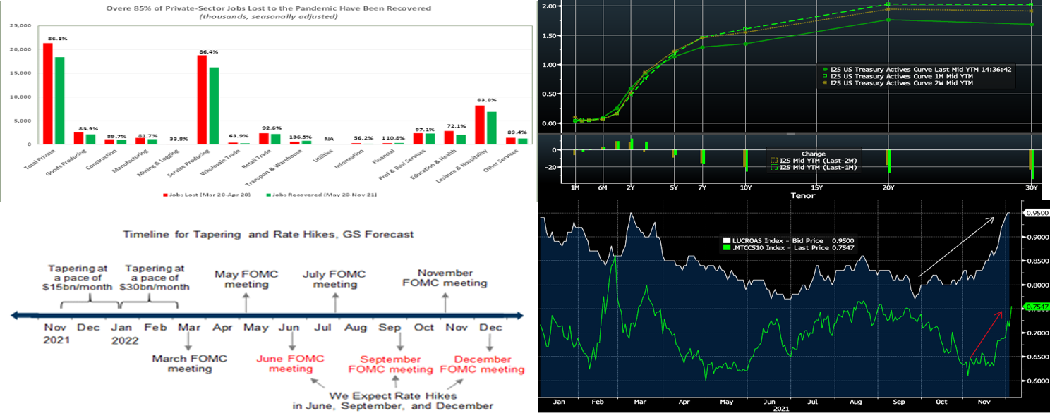 Source: Goldman Sachs Research. As noted above, an acceleration of the Fed taper appears to be a distinct possibility at this month’s FOMC. This chart portrays the timeline view of Goldman Research, as well as various other market strategists that the Fed will announce a faster pace of tapering at the December 15 meeting. Essentially, this view holds that the Fed will double the pace and thereby conclude the taper in March and position itself for the initial rate hike in June. Indeed, the market now prices (see Fed Funds futures, for reference) for this scenario. While a faster pace of tapering will result in less total buying by the Fed and thereby upwardly impact rates, the countervailing forces of ongoing Covid-19 concerns, less UST supply being issued by Treasury next year, and a perception that Fed hikes will tamper inflation all provide resistance.