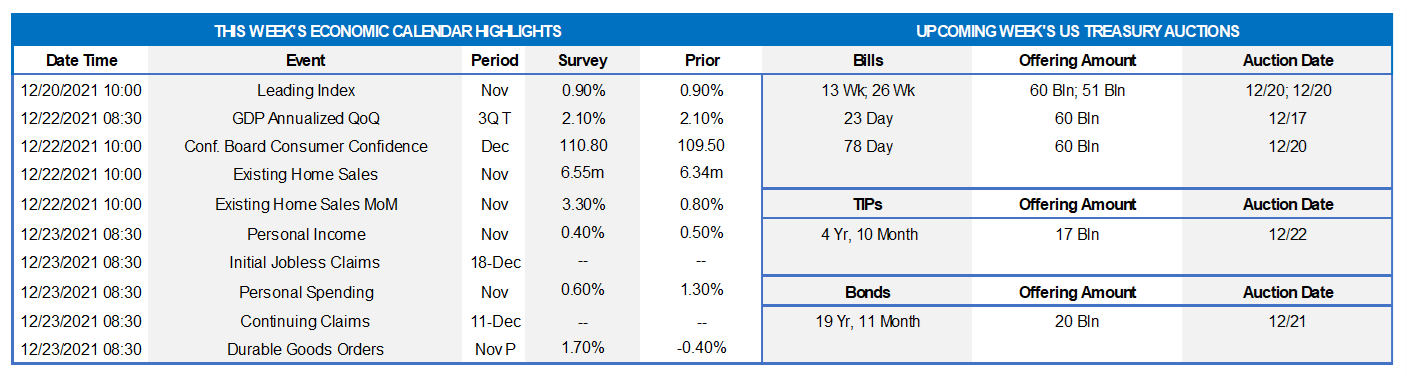 Market participants will contend with a crowded economic release calendar ahead of Christmas. Buoyed by healthy labor market conditions, consumer sentiment probably improved heading into year-end. Solid readings on home sales and capital goods shipments likely will reinforce expectations for an acceleration in real GDP growth during the final quarter of 2021. Soundings on unemployment insurance claims are expected to point to a sharp pickup in job creation and yet another drop in the civilian jobless rate in December.
