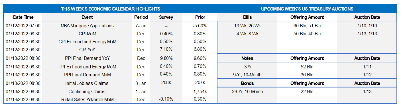 - On the UST supply front, this week brings 3/10/30-year supply. Key data for the week will be the CPI release. With the Fed “in play”, close attention is warranted on the various Fed appearances this coming week.
