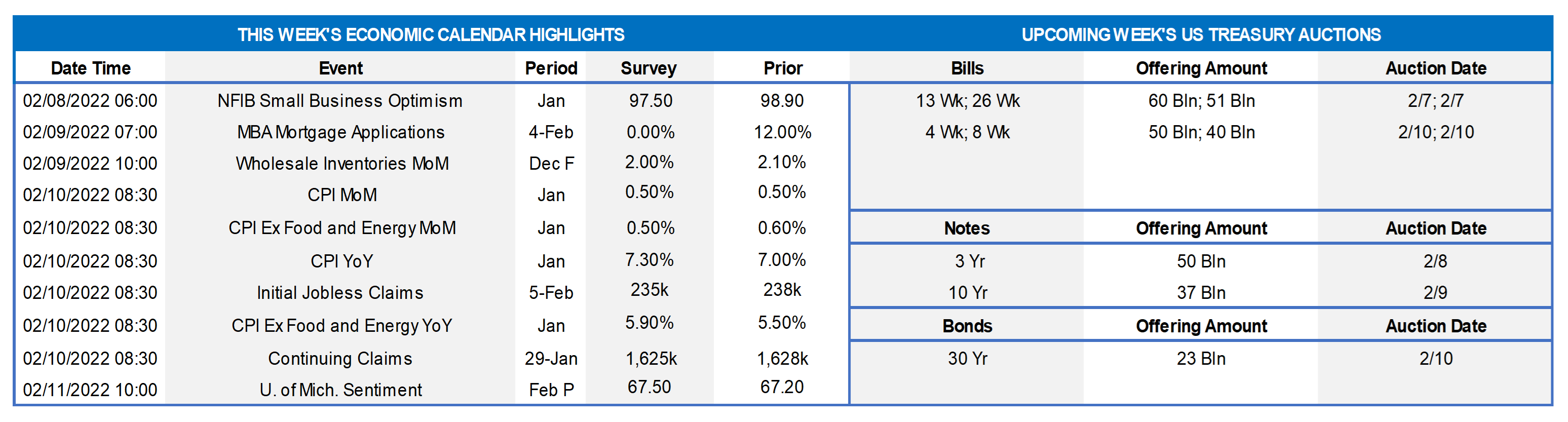 Consumer Price Index: The Street expects the Consumer Price Index (CPI) to climb by .5% in January, matching the increase recorded in December. Smaller hikes in airline fares and motor vehicle costs probably capped the rise in the core CPI excluding volatile food and energy prices at .5% during the reference period, following a .6% year-end gain. Those forecasts, if realized, would place the overall and core CPIs 7.3% and 5.9% above their respective year-ago levels, both well above the Federal Reserve’s 2% target.