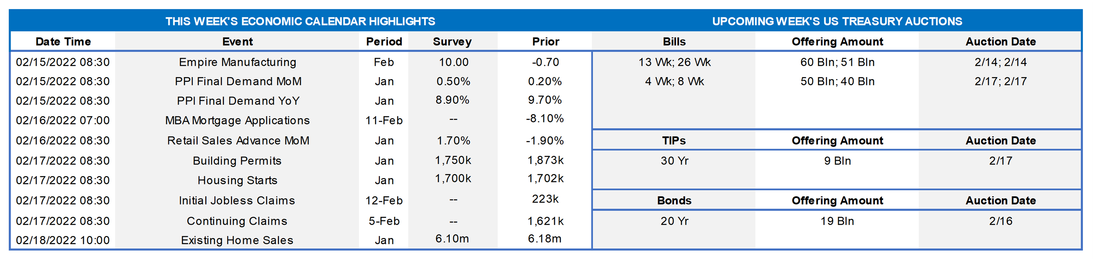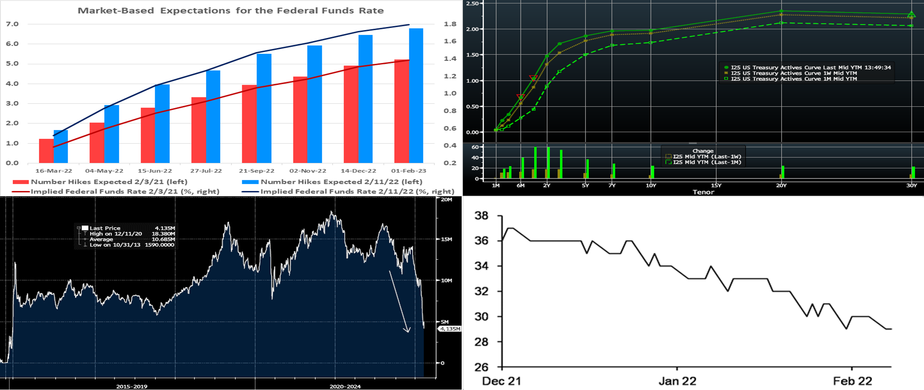 Source: Bloomberg; FHLBNY. Reports on labor market conditions and consumer prices in January, along with public comments by Fed officials, have prompted dramatic changes in market expectations of prospective interest-rate increases. Indeed, the market now prices for ~85% probability that the initial hike in the federal funds rate target range will be a 50 bps move to a new .5% to .75% range. For 2022, the yield curve currently prices the equivalent of ~6.5 hikes of 25 bps, up from a little less than five prior to the release of last month’s jobs report. Multiple market strategists this week revised higher their forecasts of Fed hikes, in response to the inflation data and Fed-speak. The most notable Fed-speak, though subsequently cooled somewhat by others, was Fed Governor Bullard’s expressions on Thursday of potential support for a 50 bps and/or inter-meeting “emergency” hikes.