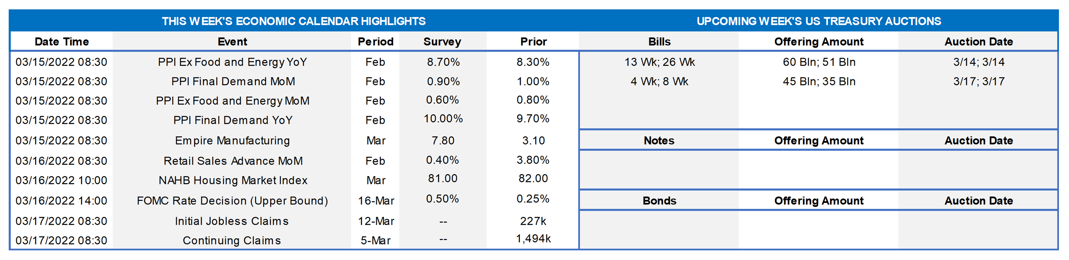 - On the UST supply front, this week serves a reprieve from auctions. Markets and rates remain highly prone to move on Ukraine news, with this week the all-important FOMC added to the mix. Given market volatility, members should monitor conditions for potentially more optimal timing on transactions. Please call the desk for information on market dynamics, rate levels, or products.