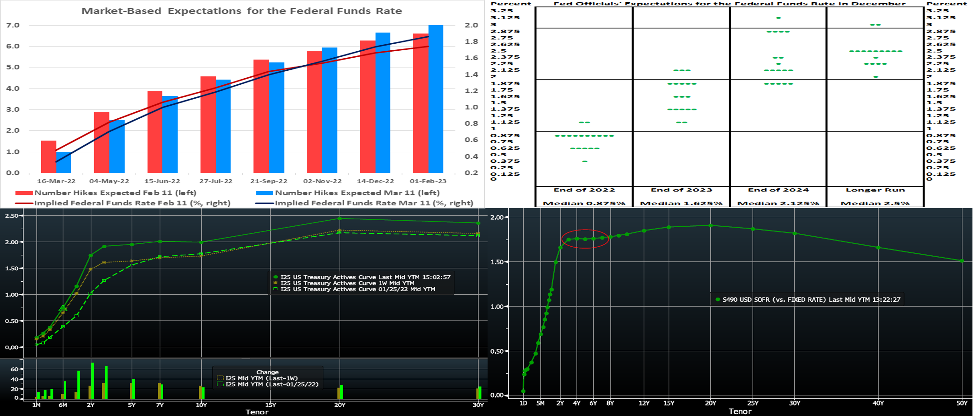 Source: Bloomberg. Following on the above, shown here is the Fed’s December “dot plot”. Its end of 2022 median target rate of .875% is clearly well below that being currently priced by the market. Fed-speak since the December meeting has undergone a more hawkish evolution, and so these nearer-term dots appear prone to upward adjustment. Of interest in the Fed’s fresh “dot plot” will be its expectation of the “longer run” rate. While it was a median of 2.5% in December, the market has persistently priced (via fed funds futures and OIS curve) at lower levels, perhaps out of anticipation of inflationary forces ebbing once Fed hikes are underway and the economy adjusts post-pandemic.