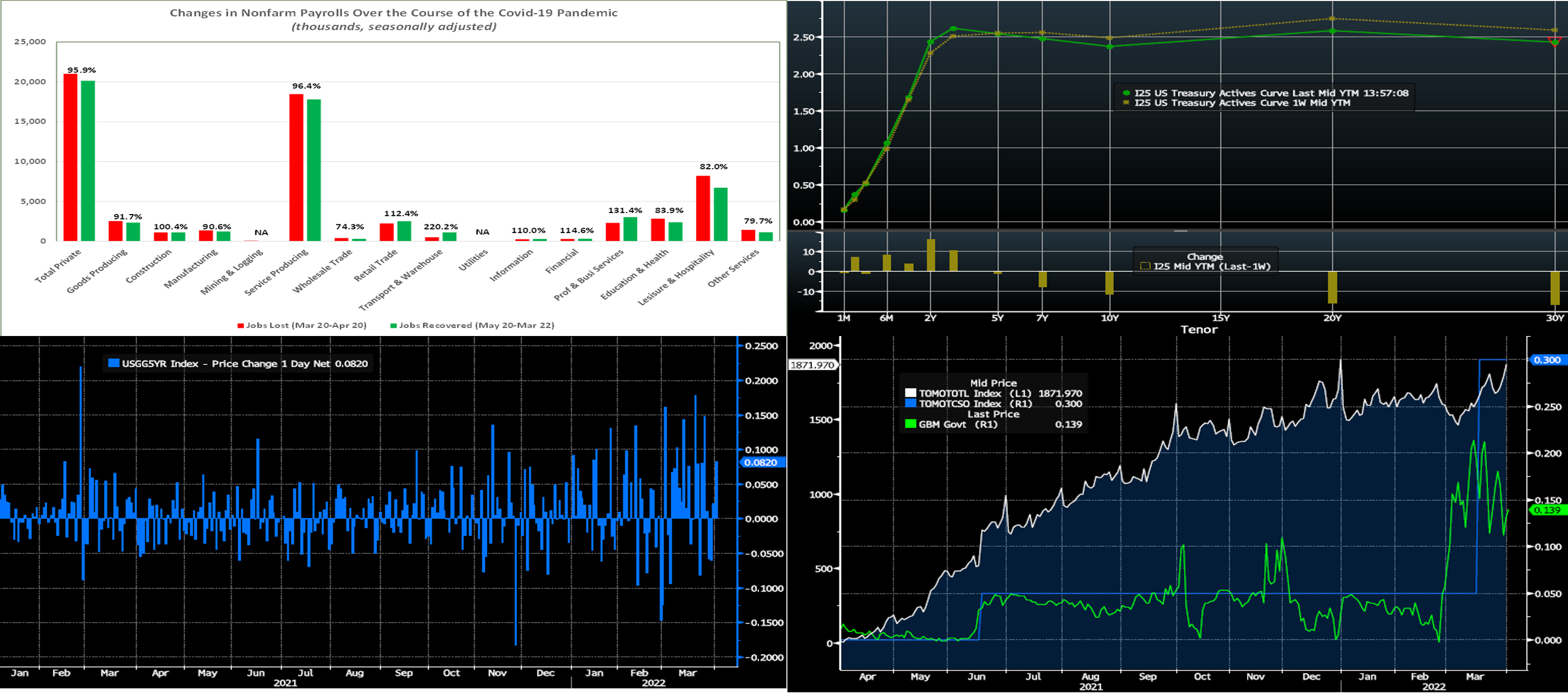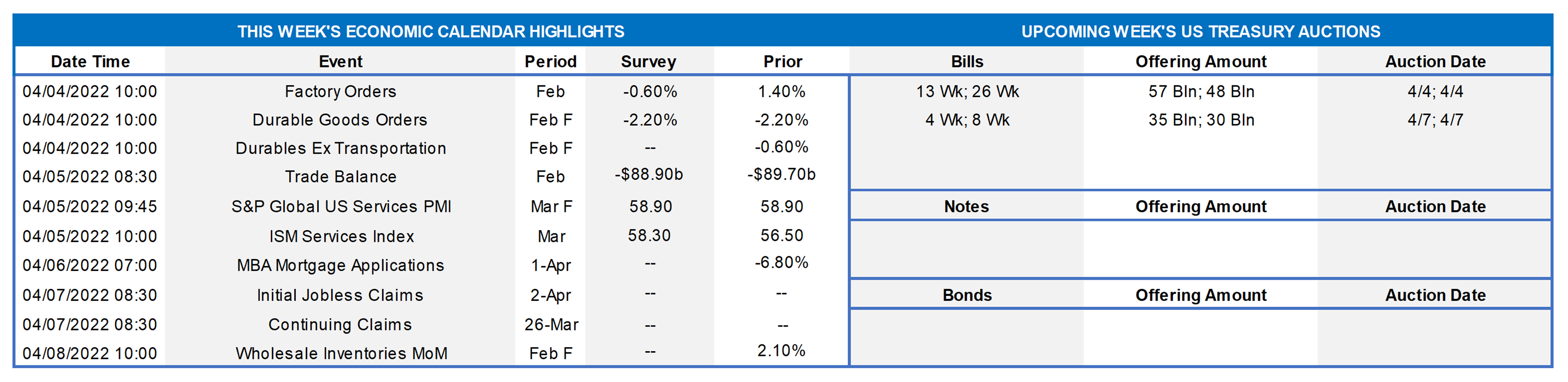 Source: Bloomberg. Note: Top pane is yield (%), bottom pane is change (bps). The UST yield curve notably flattened week-over-week, with shorter yields rising, the 5-year roughly unchanged, and the longer sector yields progressively lower out the curve. Much of the move occurred on Friday in reaction to the strong jobs report. The market now prices for ~80% chance of a 50 bps hike at the May 4 FOMC meeting; for the rest of 2022, it prices for ~217 bps of cumulative hikes from the current level. Fed Governors, meanwhile, have voiced support for potential 50 bps hikes at upcoming meetings. The dramatic flattening of the curve has resulted in various inversions. For instance, the 2-year/10-year slope was ~-5 bps as of Friday afternoon. The 2-year/30-year inverted Friday but subsequently traded on top of each other. The Russian invasion of Ukraine is still in the news but not leading to any doubt that the Fed will march onwards with rate hikes. Given limited economic data this upcoming week, market focus will remain on Ukraine developments and any Fed-speak which might impact pricing of Fed hikes.