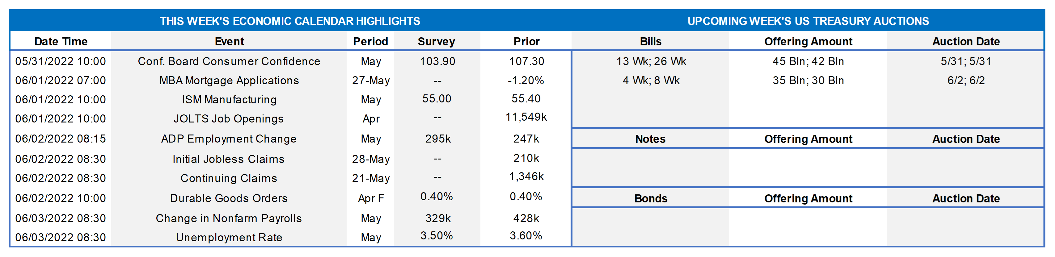 Market participants will contend with a crowded data calendar next week. Upcoming reports are expected to be decidedly mixed. Labor-market soundings likely will be solid, with job openings soaring to a record high and the unemployment rate dipping to a level not seen in half a century. Reflecting challenging supply conditions, home prices probably remained on a tear at the end of Q2. Concerns about rising prices and interest rates are expected to weigh on consumer confidence. Available canvasses suggest that the Institute for Supply Management (ISM) closely followed manufacturing and service-producing activity gauges moved lower in May. The Federal Reserve’s Beige Book will provide useful color on business activity within the FHLB-NY coverage area.