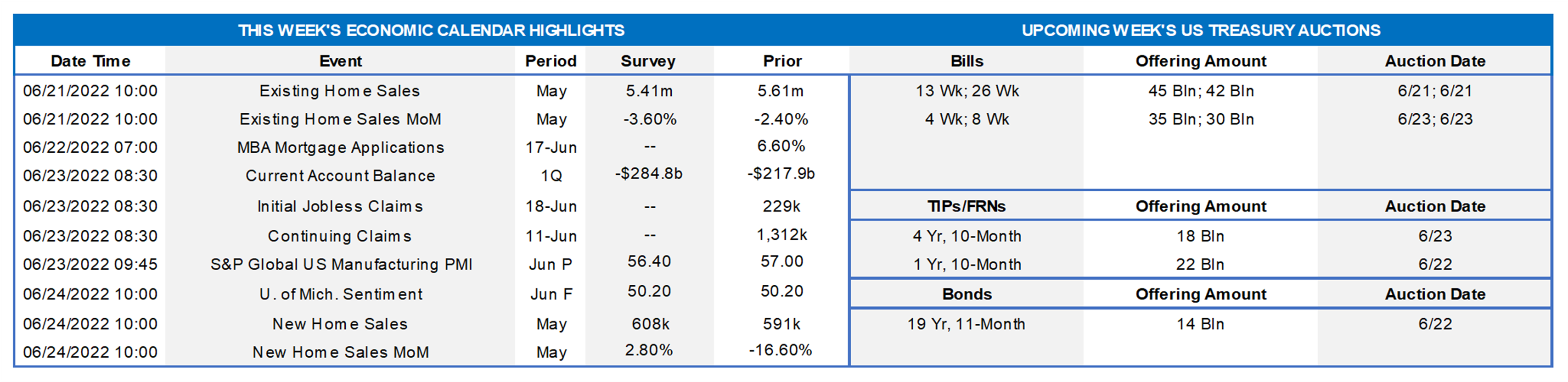 - June 22 Philadelphia Fed President Harker and Richmond Fed President Barkin to discuss the economic outlook.