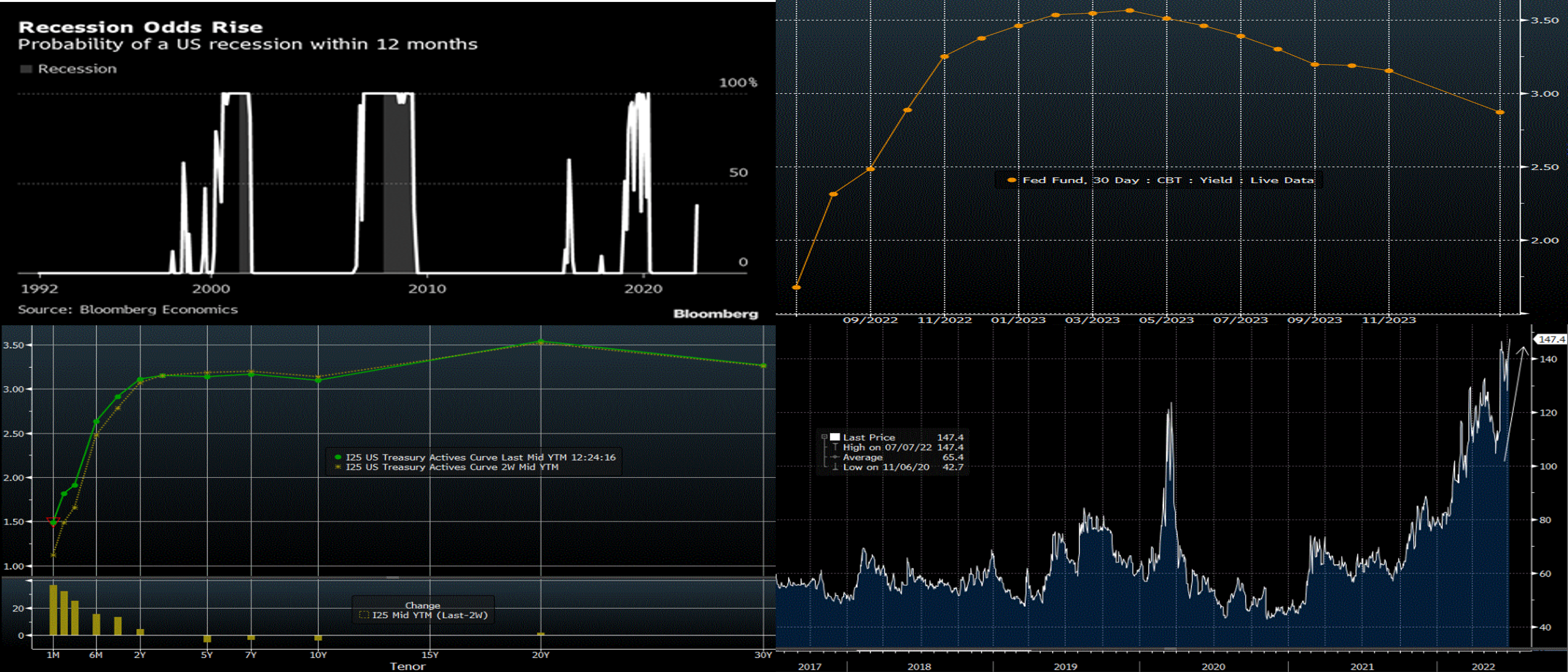 Source: Bloomberg. Shown here is the Fed Funds Effective futures curve (RHS, %), as of this past Friday morning. To help illustrate the above comments, here can be seen that the market prices aggressive Fed hikes over the next 6 months, culminating in a peak of ~3.55% in April 2023. Thereafter, the path subsides and declines; essentially, the market prices for a strong probability that the Fed will need to halt and eventually reverse policy tightening. This market pricing is a primary reason for the current extremely flat (or inverted, at some points) yield curve. And constant changes in this Fed pricing are also a primary causal factor of the large swings and volatility of rates of the past few months.