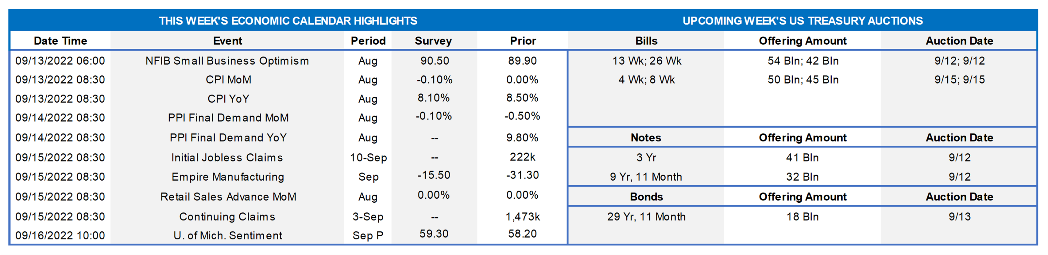 - On the UST term supply front, this upcoming week serves 3/10/30-year auctions. Market focus will remain on economic data, particularly Tuesday and Wednesday’s inflation reports. Fed-speak will be absent, owing to the pre-FOMC blackout period. Please call the desk for information on market dynamics, rate levels, or products.