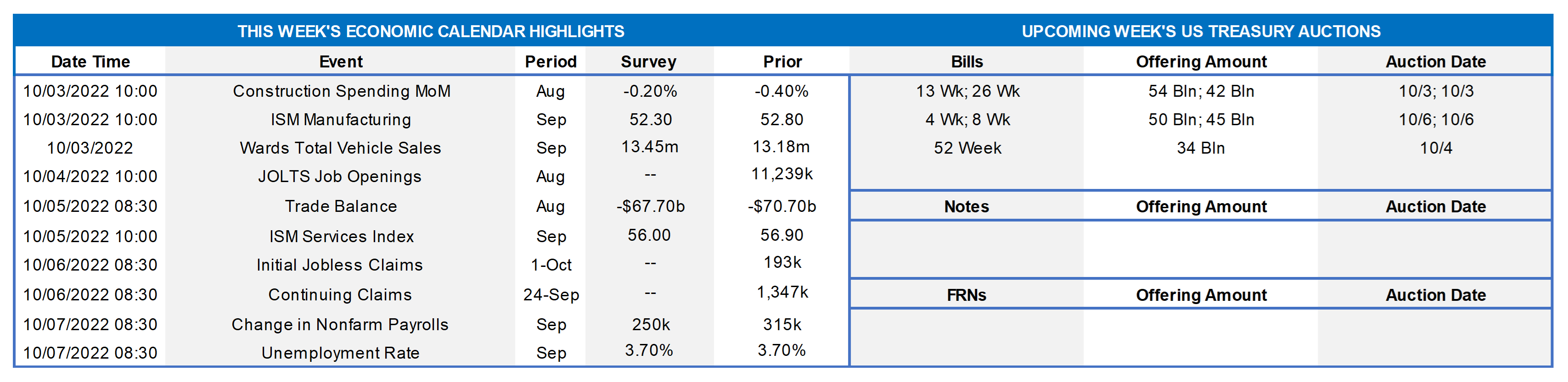 - Short-end rates finished mixed week-over-week, with 1-month-and-in ~7 bps lower but longer tenors up a few bps. The market slightly tamed the odds of more aggressive forthcoming Fed hikes, despite persistent hawkish comments from Fed members. The extreme volatility experienced this past mid-week likely prompted investors to seek safety in ultra-short instruments; indeed, the Fed’s RRP reached a record $2.43trn. As of this past midday Friday and a tad lower from the week prior, the market priced for a 100% chance of a 50 bps hike at the November 2 FOMC, with ~50% chance of 75 bps hike. For 2022 cumulatively from now, the market prices for ~113 bps of hikes.