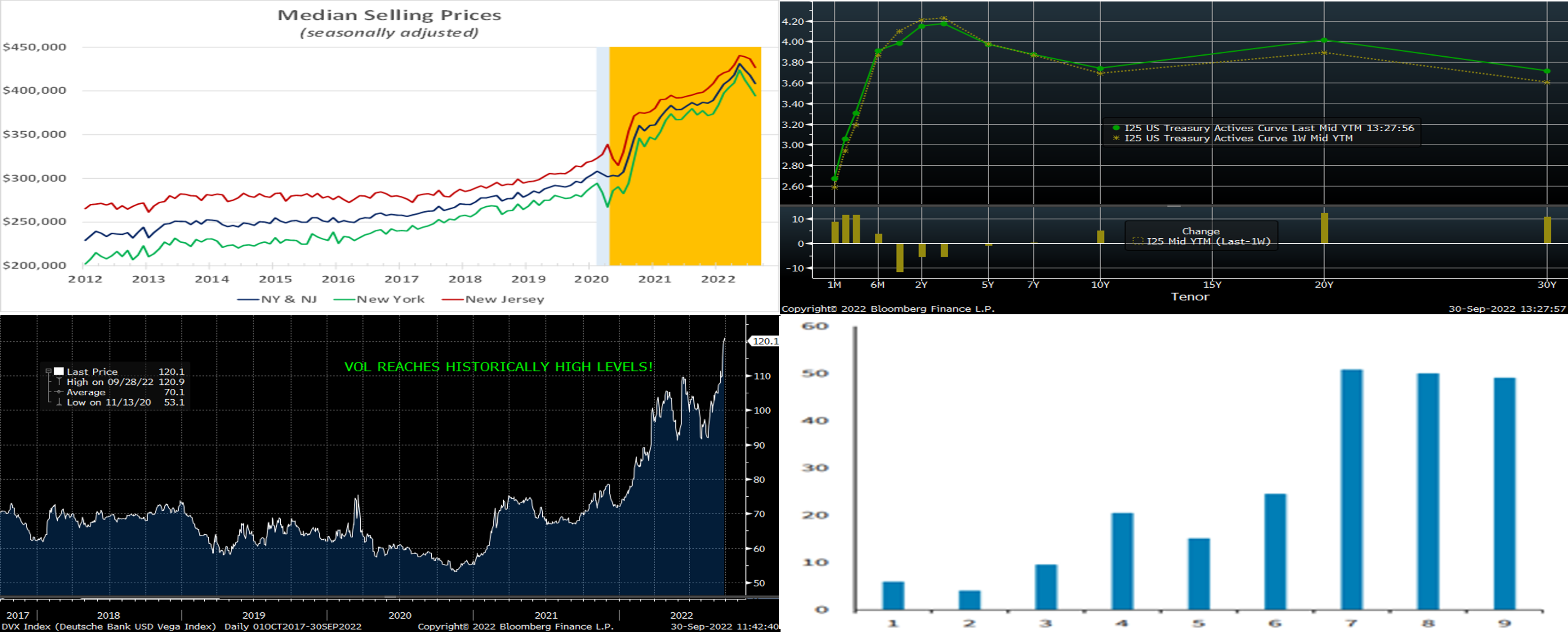 Source: Bloomberg. Note: Top pane is yield (%), bottom pane is change (bps). The UST curve, as of Friday afternoon, finished steeper but modestly changed from the week prior, especially given the mid-week volatility that was driven mostly by developments in the UK gilt (government bonds) market. An example of the large mid-week moves was the 5-year SOFR swap which swiftly declined from ~3.92% late Tuesday to 3.68% on Wednesday and subsequently bounced up and down before stabilizing ~3.76% at week’s end. As of this past Friday afternoon and slightly lower from last week even amid persistent hawkish Fed-speak, the market priced for a 100% chance of a 50 bps hike for the November 2 FOMC, with ~50% chance of a 75 bps hike. For 2022 cumulatively from now, the market prices ~113 bps of hikes. The market anticipates further increases to ~4.46% (~24 bps less than implied in last week’s curve) by next May, but, in contrast to Fed officials, still expects the Fed to shift gears beyond that point. The current 4.21% Fed effective rate anticipated by the market at end-2023 is well below the 4.625% median projection in the latest Fed “dot plot.” In this regard, this section of the curve could be the most vulnerable to moves in either direction in response to fresh economic data.