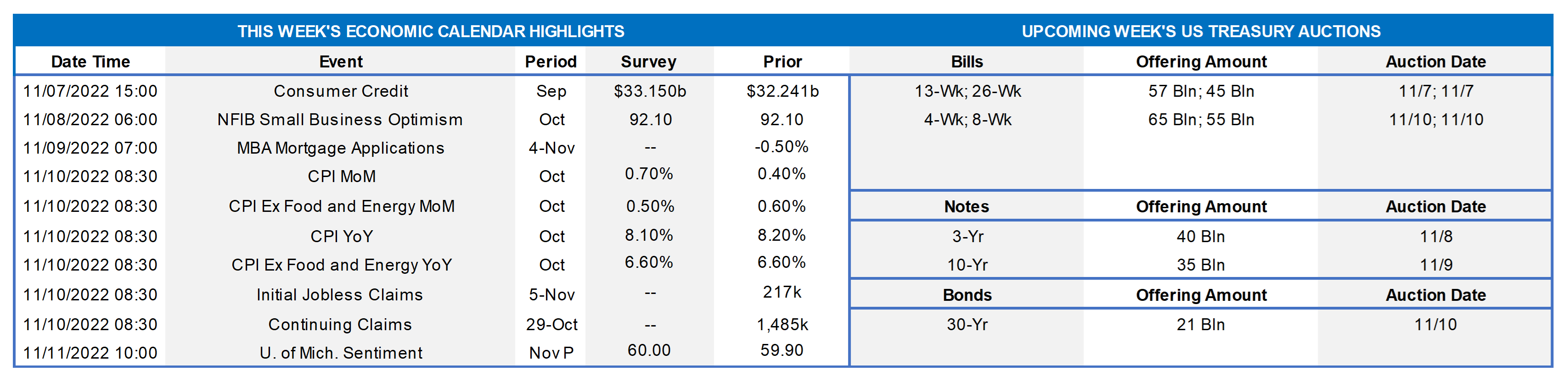 - On the UST term supply front, this upcoming offers a duration-heavy slate of 3/10/30-year auctions. In a holiday-shortened week (Friday is Veterans Day – bond markets closed), market focus will clearly be on Thursday’s CPI data. Please call the Member Service Desk for information on market dynamics, rate levels, or products.
