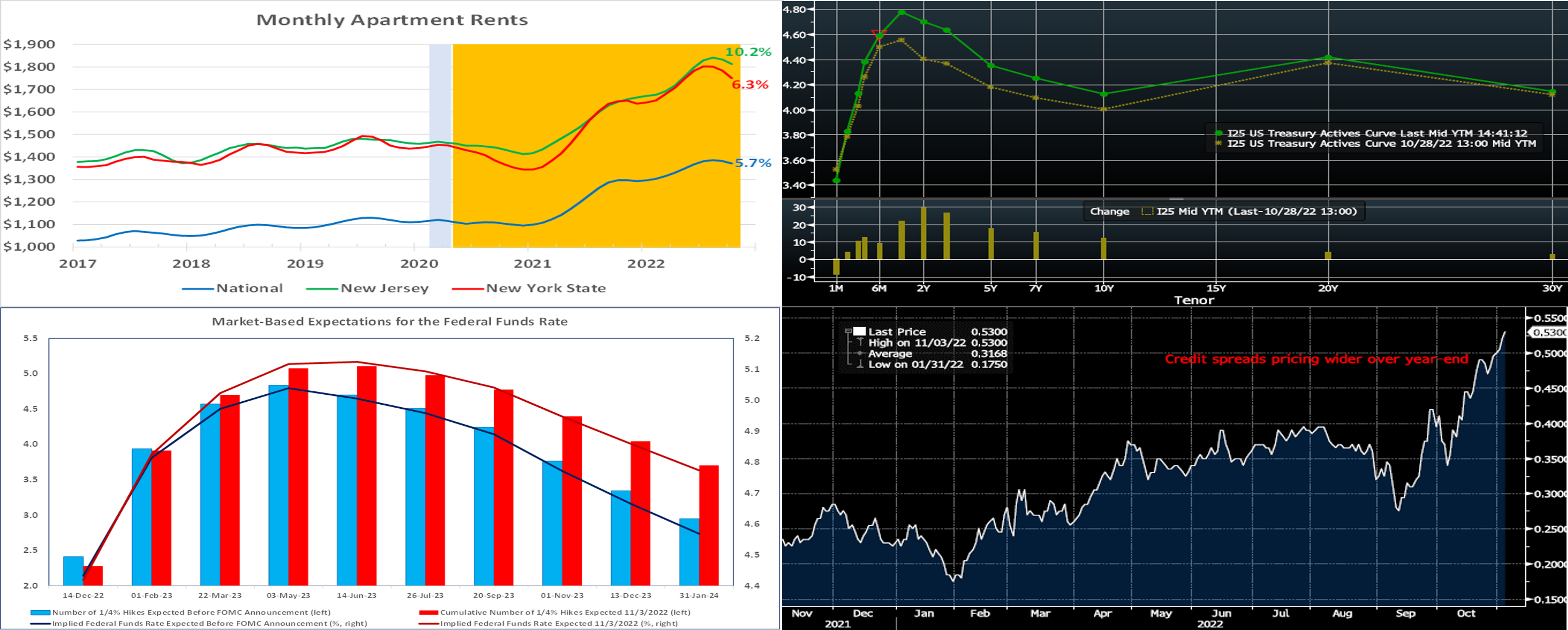 - Short-end rates again finished markedly higher week-over-week, spurred by the Fed’s 75 bps rate hike which led the market to also price for a higher peak fed funds rate in spring-2023; please see the prior slide for more details. Our very short tenor rates led the way, in line with the rate hike, but the 3 to 6-month sector also moved higher on account of the market’s re-pricing of the Fed.
