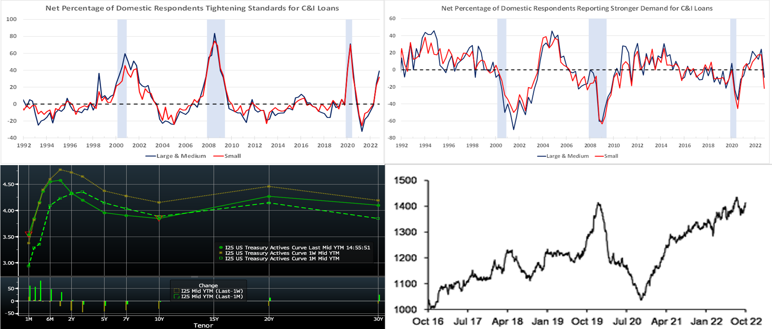 Source: Board of Governors of Federal Reserve; FHLB-NY. Notes: Blue-shaded area denotes recessions. The Federal Reserve Board’s October 2022 Senior Loan Officer Opinion Survey on Bank Lending Practices revealed a general tightening of standards across virtually all loan categories during the summer quarter. The net percentages of loan officers reporting tighter lending standards for Commercial & Industrial (C&I) loans to large, medium, and small firms clocked in at 39.1% and 31.8%, respectively, during the reference period. These results marked the broadest firming, as seen here, in practices since the spring of 2020.