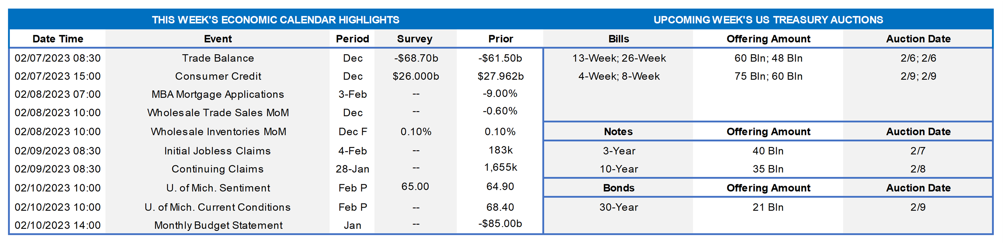 Having taken the Federal Open Market Committee’s latest rate hike in stride and post the latest monthly jobs report, market participants will face a very quiet data week. The upcoming report on unemployment insurance claims likely will reveal that labor market conditions remain extremely tight. Continued solid hiring, and signs that inflation is ebbing, probably buoyed consumers’ spirits in early February. Scheduled interviews of Federal Reserve Chair Jerome Powell and New York Fed President John Williams may provide some useful color on policymakers’ current thinking on the necessity of further rate increases.