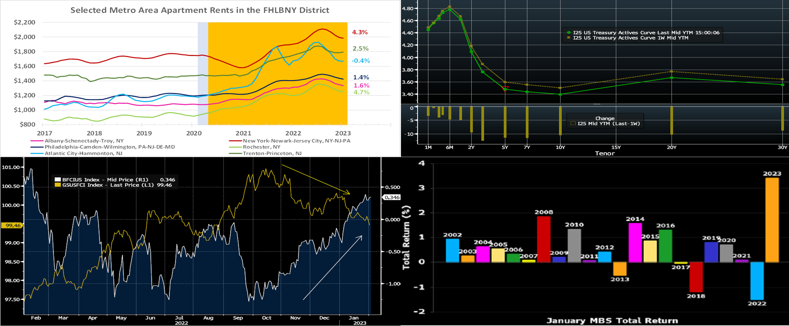 Source: Bloomberg. The start of 2023 brought relief to MBS, as the sector posted its best total return performance in decades. Shown here are the January total returns (LHS, %) of the Bloomberg Agency MBS index over the past 20 years, with the past month clearly an upside highlight. After a brutal 2022 negative total return of ~11%, by far the worst in decades, this upward move should prove welcome relief for investors. It should also alleviate some of last year’s pressure on bank liquidity coverage ratios as well as Available-for-Sale investment portfolios and the accompanying impacts on AOCI and capital levels. The duration extension of MBS over the past year also should improve the convexity profile of the sector. For members who may still have a need/requirement to hedge an upward move in rates but fear a further move downward and potential prepay risk in their MBS portfolio, our callable advance product may be something to consider as a hedge.