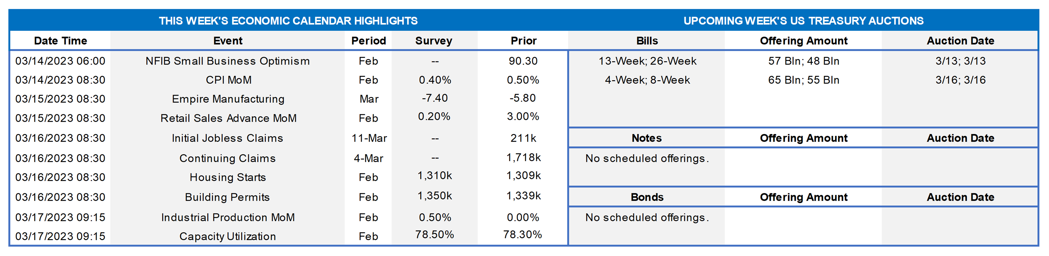 - Given the Fed’s ongoing tightening and data-dependent posture, rates will be most responsive near-term to the data calendar, especially given the Fed blackout mode prior to the March 22 FOMC. This upcoming week’s CPI and PPI reports are likely to be influential events.