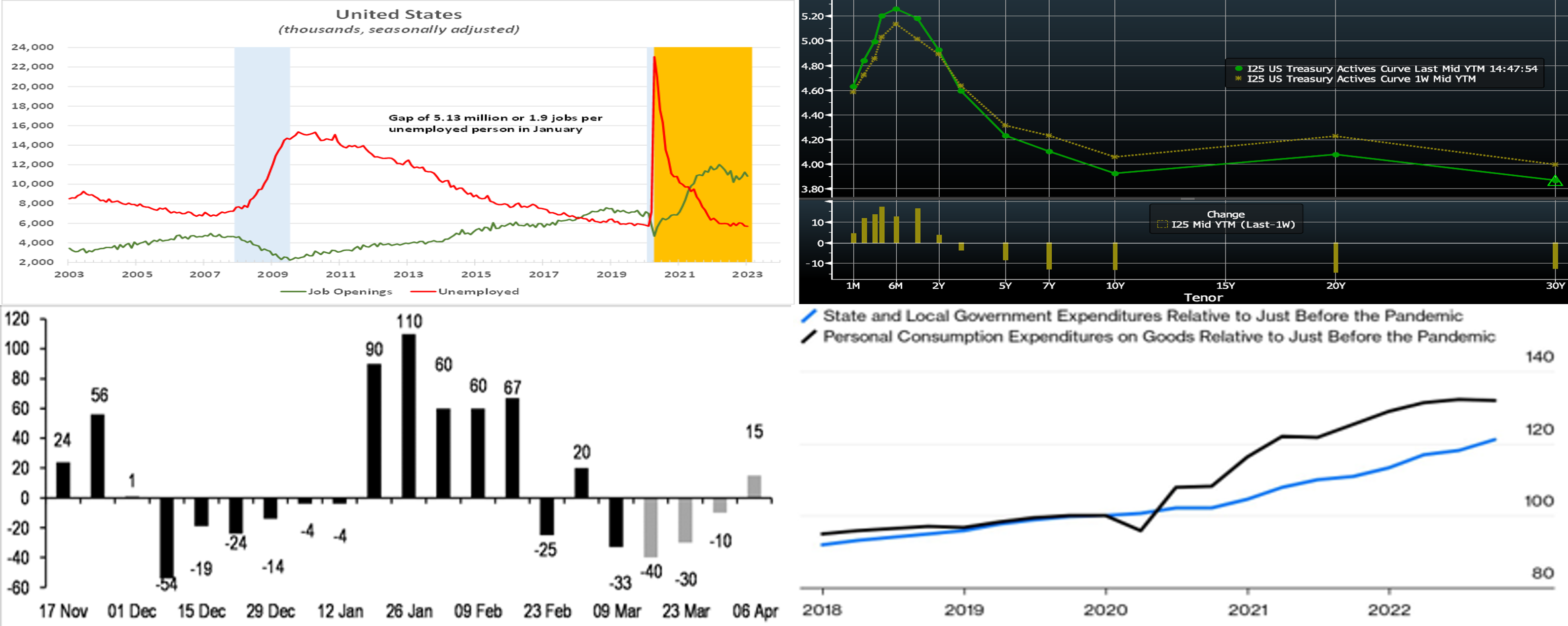 Source: Bloomberg. Top pane is yield (LHS, %), bottom pane is change (bps). From last Thursday afternoon to this, and after reversing a significant upward move from days prior, UST yields finished higher in the 2-year-and-in sector but lower thereafter. The main market-mover of the week was Fed Chair Powell’s appearance before Congress on Tuesday morning in which he essentially cited, “if the totality of data indicate that more hikes are warranted, then the Fed will increase the pace and be restrictive for some time.” In reaction, the market repriced higher and longer the prospective path of Fed hikes, and the 2-year yield hit its highest level since 2007. Subsequently on Thursday, yields retraced notably lower, as the higher levels appeared to attract real money and short-covering buyers before Friday jobs data; there was also equity market weakness in the banking sector that may have spurred safe-haven buying in USTs. For the March 22nd FOMC, the market now prices a 100% probability of a 25 bps hike, with ~65% chance of a 50 bps hike. The market’s pricing for end-2023 is now ~5.44%, up from last week’s 5.33%. The market has also priced higher/later the peak rate to ~5.60% for this October, up from ~5.50% a month later compared to a week ago.