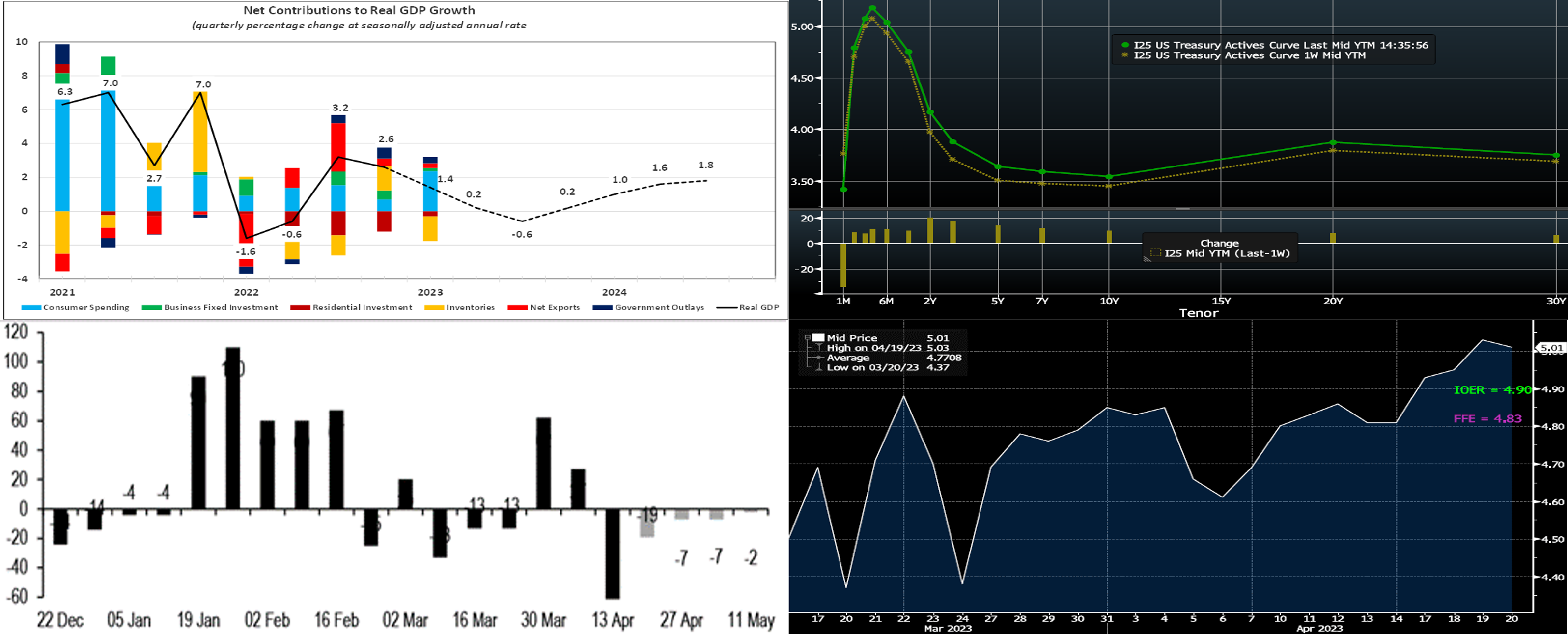 Source: Bloomberg. Top pane is yield (LHS, %), bottom pane is change (bps). From last Thursday afternoon to this one, UST term yields were higher, with the 2-year up by ~20 bps to lead the move. The 1 to 5-year sector led the curve’s bear flattening. Economic data continues to generally reflect some moderation in inflation forces and a bit of loosening in the job market, but it appears not enough and too early to dissuade the Fed from another rate hike. Multiple Fed members this week indicated that, while acknowledging some economic slowdown and potential credit constraints building, another rate hike is likely in store. As of this Thursday afternoon’s writing, the market prices the odds of a 25 bps hike at the May 3rd FOMC at ~88% (up from last week’s 73%), and June, at ~5.11% (up 10 bps from last week), is the peak rate on the short-end Fed Funds forward curve. The year-end forward is ~4.57%, up 24 bps from last week, and so Fed easing is still priced into the curve for later this year but to a less extent than last week and much less than during March’s turmoil. Please call the Member Services Desk for further information on market dynamics and/or products.