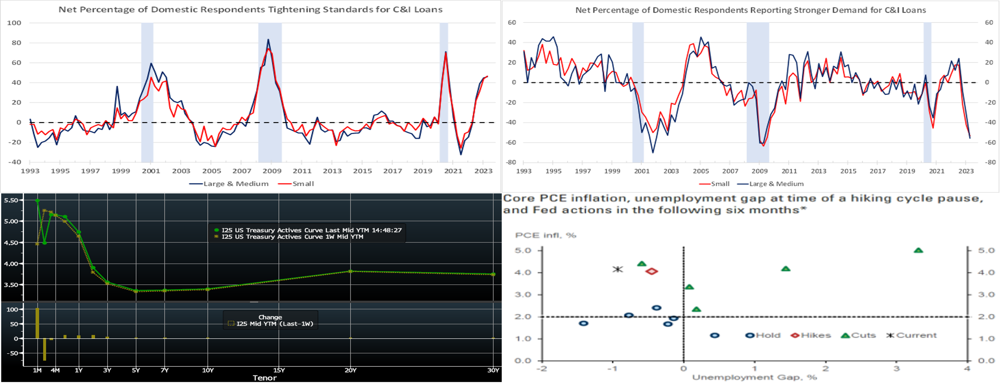 Source: Goldman Sachs Research; Haver Analytics. As cited above, the market currently prices for Fed cuts this year. But many economists/strategists offer counter-arguments to this view based on history and inflation/employment metrics. This chart reflects the results of a Goldman Sachs analysis, over the past four decades, of the Fed’s behavior in the six-month periods after halts in hiking cycles. It found that the Fed rarely eased when labor markets were tight. Surprisingly, this mattered more than any shifts in inflation. Indeed, the most common outcome has been an “on-hold” Fed. In contrast, periods with material deterioration in labor markets have more reliably resulted in Fed rate cuts. Overall, the findings reveal that when job markets are “tight” (meaning a low unemployment gap, i.e., towards the left side of the x-axis), as it is at the current juncture, pauses tend to become extended. It’s only when employment is seriously deteriorating (on the right side of the chart) that the Fed pivots swiftly to cuts. Given this context, some of the Fed cuts currently priced into the curve may be the result of the market pricing a small probability of larger (50 bps+) cuts, potentially in reaction to “emergency” conditions spurred by banking industry and/or debt ceiling concerns. (For inquisitive types, the unemployment gap is generally defined as the difference between the actual unemployment rate and the efficient unemployment rate.)
