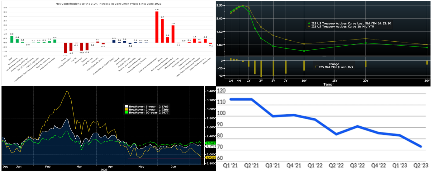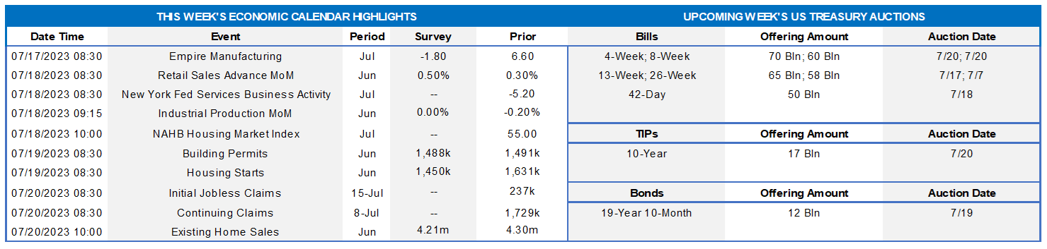 Source: Bloomberg. Top pane is yield (LHS, %), bottom pane is change (bps). From last Thursday afternoon to this one, and for the first time in weeks, UST term yields moved lower. The 2 to 7-year sector led the move, with the 3 and 5-year over 40 bps lower. The major instigator for the move was the lower-than-expected inflation data releases; in addition to the CPI cited above, Thursday’s release of PPI (Producer Price Index) also came in below expectations and thereby prompted another leg lower in yields. Consequently, the market reversed (pushed lower) some of its recent pricing of the Fed for later this year and 2024. In essence, the market now prices a greater chance of a “one last one and done”. As of this writing, the market still prices the odds of a 25 bps hike at the July 27th FOMC at ~91%. The 2023 peak funds rate stands at ~5.38% in November, or ~8 bps lower than last week. The year-end Fed Funds forward is ~5.30%, ~12 bps lower than a week ago. The market’s repricing was more pronounced out the curve in 2024-25; for instance, the year-end Fed Funds was ~4.25% last week and is now ~3.67%! Please call the Member Services Desk for further information on market dynamics and/or products.