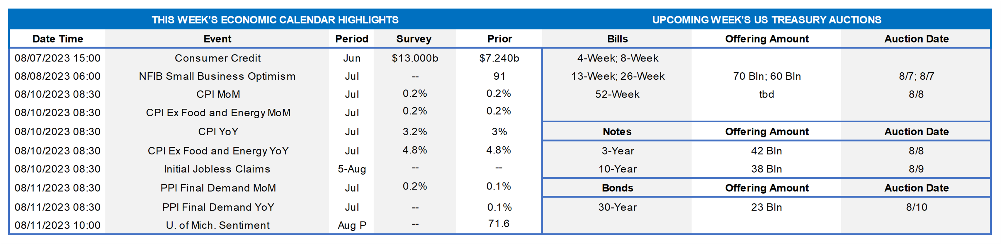 Source: Bloomberg. Top pane is yield (LHS, %), bottom pane is change (LHS, bps). From last Thursday afternoon to this one, the curve moved higher and steeper. While 3-year-and-in was modestly changed, the 5-year-and-out sector was higher by 7 to 25 bps. There were two main causal factors for the curve’s bear steepening. One was Fitch’s downgrade of the US credit rating which, while not being a major game-changer, did exert some selling pressure on longer tenor USTs. The second factor was Treasury’s announcement of rising UST issuance and bigger auction sizes ahead, with a major slug of 10 and 30-year paper this upcoming week. In terms of market-implied pricing of the Fed, the 2023 peak Fed Funds rate in November now stands at ~5.43%, steady from last week. Essentially, the market is pricing a ~40% chance of one more 25 bp hike this year. The year-end forward is at ~5.40%, also steady from last week. The years 2024 and 2025 changed modestly from a week ago, with the year-end 2024 forward ~6 bps lower, at 4.15%, from a week ago. The upward move in yields was concentrated past 5-year. Please call the Member Services Desk for further information on market dynamics and/or products.