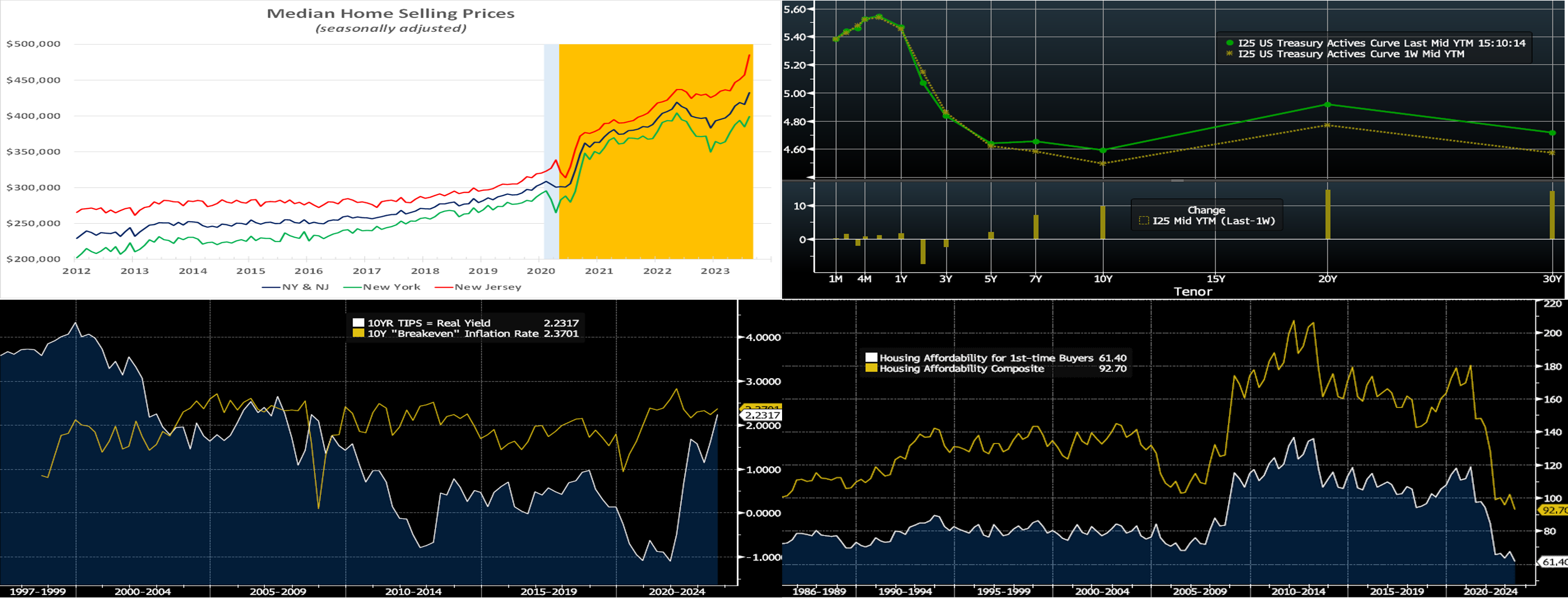 Source: Bloomberg. If there was ever a time that the FHLB-NY housing affordability programs (Affordable Housing Program, Homebuyer Dream Program, visit https://www.fhlbny.com/community/housing-programs) can help make a difference, it is the present. Higher rates, along with stubbornly high home prices underpinned by lack of supply, have negatively impacted home affordability. Shown here are two National Association of Realtors home affordability indices, namely the Housing Affordability Composite index (RHS, gold) and the Housing Affordability for 1st-time Buyers index (RHS, white); they are both at historical lows (i.e., less affordable) points. Direct from our September 5th FHLB-NY President’s Report: “On August 22, we made our favorite announcement of the year, reporting on our annual Affordable Housing Program grants. This year, we announced $42 million in grants in support of 42 housing initiatives to help create or preserve 2,693 affordable homes across our District and beyond.”
