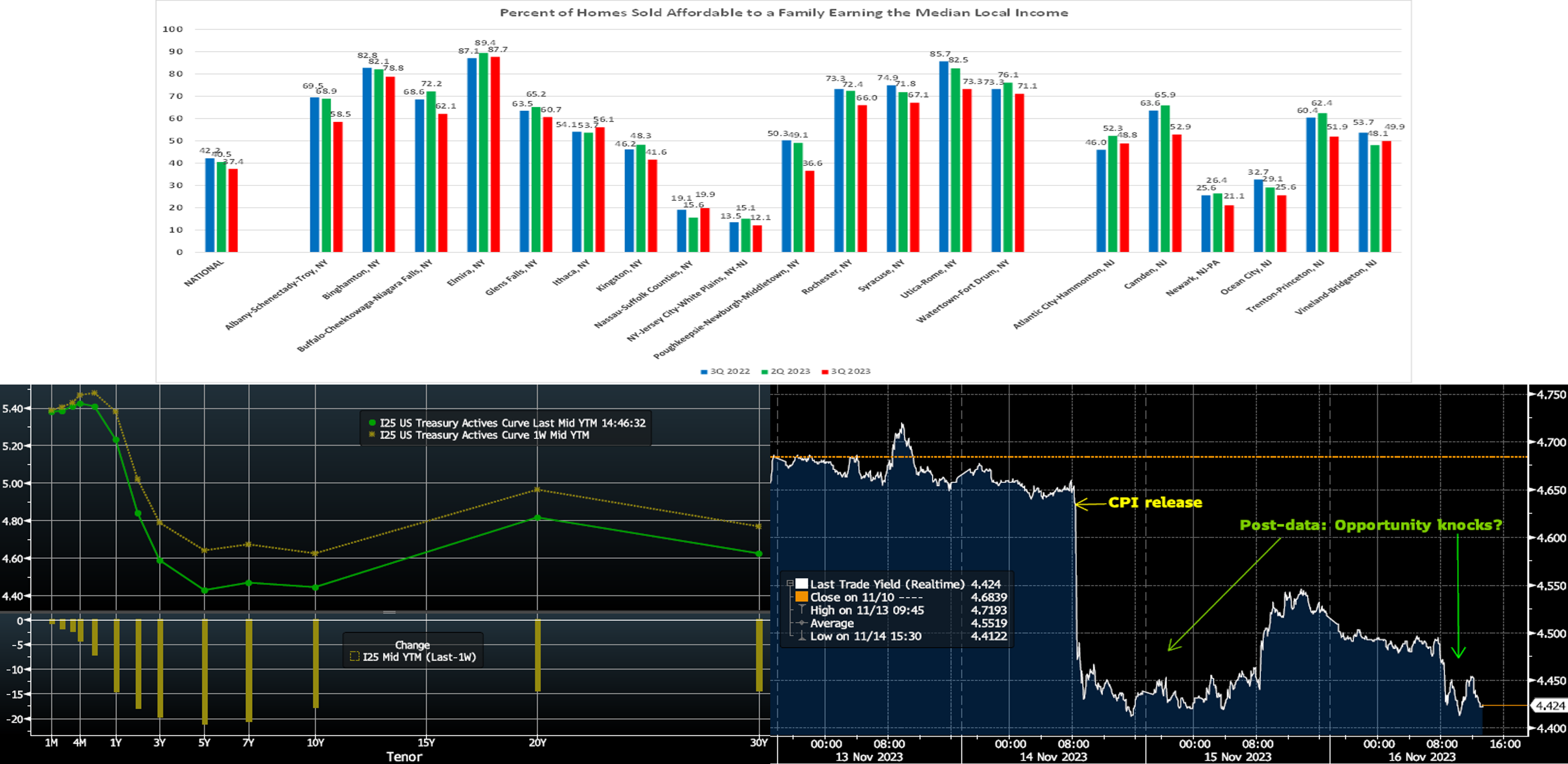 Source: Bloomberg. Top pane is yield (LHS, %), bottom pane is change (LHS, bps). From last Thursday afternoon to this one, the UST curve moved notably lower, led by the 3 to 7-year sector; the 5-year was ~23 bps lower week-on-week. A few “soft-landing” data points spurred the move. The lower-than-expected CPI was the highlight, followed by softer PPI on Wednesday and then slightly higher jobless claims. Moreover, consumer spending data reflected a decelerating pace. “Fedspeak” veered to the hawkish side, in an apparent effort to counteract the loosening of financial conditions caused by lower yields and higher stocks over the past two weeks. At this juncture, further yield moves to the downside may require another dose of friendly data. In terms of market-implied pricing of the Fed, the chance of another hike has been almost fully priced out. Meanwhile, cuts have been priced into the curve for mid-2024, with ~80% probability of a 25 bps cut in May. The year-end 2024 forward is ~20 bps lower week-on-week, now ~4.345%. The recent decline in longer term rates should offer some welcome relief to mortgage applicants and fixed income asset portfolios, including bank AOCI ledgers.