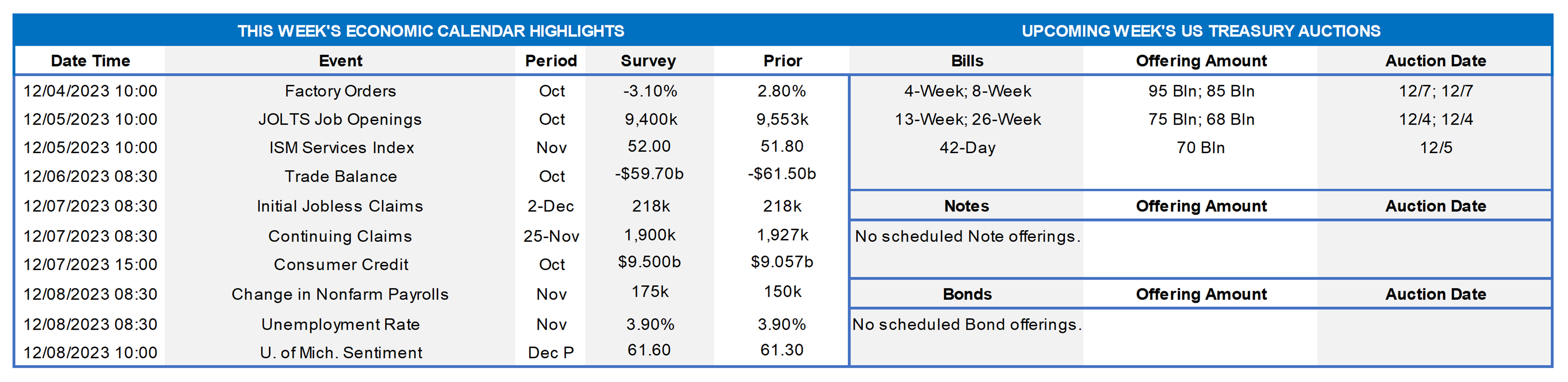 - With the Fed in blackout mode before the December 13th FOMC, the jobs report will likely be the main event this upcoming week.