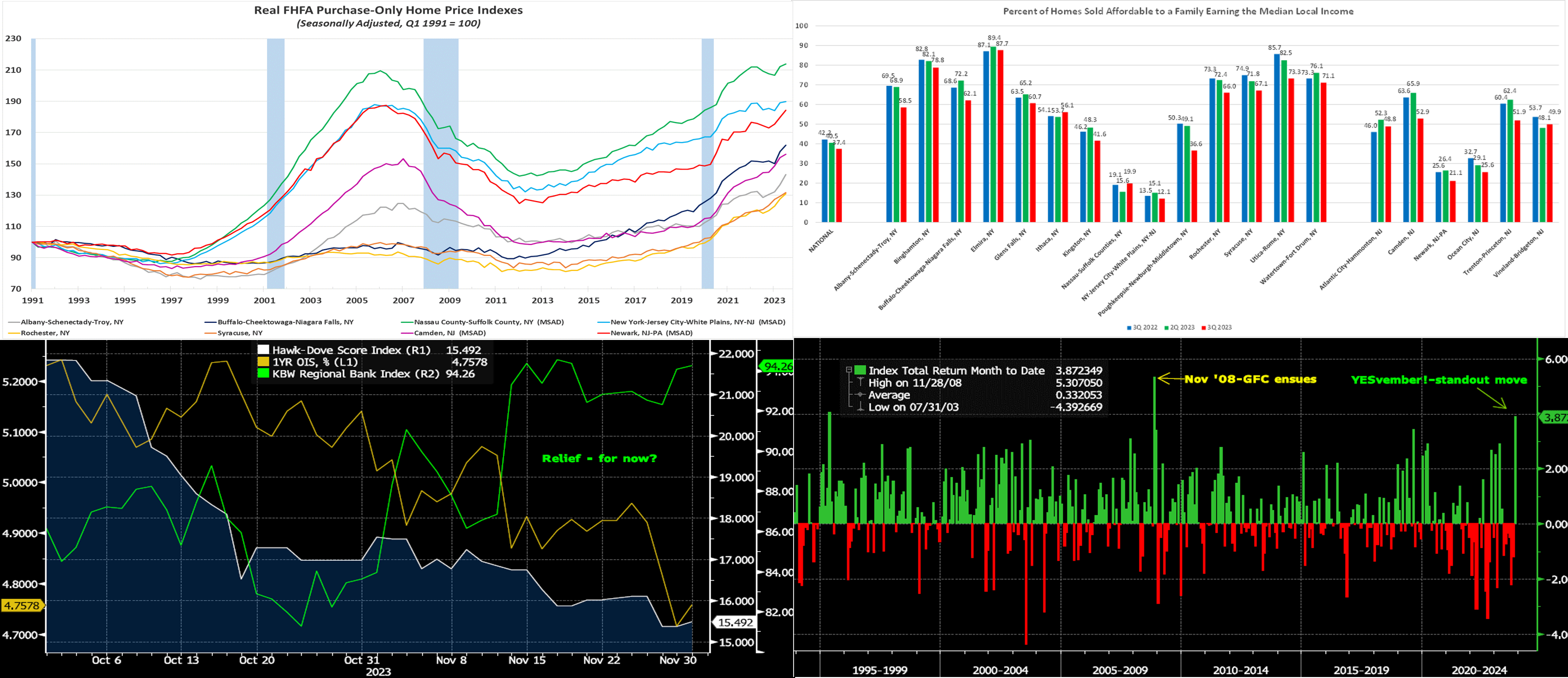 Source: Bloomberg. Shown here is a snapshot of the past two months and the notable moves of November. Per the decline in the JP Morgan Hawk-Dove Score Index (RHS-1, White), Fedspeak has moderated from previously more hawkish levels. Indeed, this observation was evidenced in the past week, per the color above. In turn, owing to softer Fedspeak and some decelerating inflation data, the market has more aggressively priced in rate cuts over the next 18 months, as seen here in the nearly 50 bps drop of the 18-month Overnight Index Swap (LHS, Gold, %, proxy for average Fed Funds Effective over period). Meanwhile, these developments have brought welcome relief to equity markets and the bank sector, as the KBW Regional Bank Index (RHS-2, Green) has risen ~14% in November! Has the market has gotten ahead of itself? Upcoming data will be of paramount importance to direction from here.