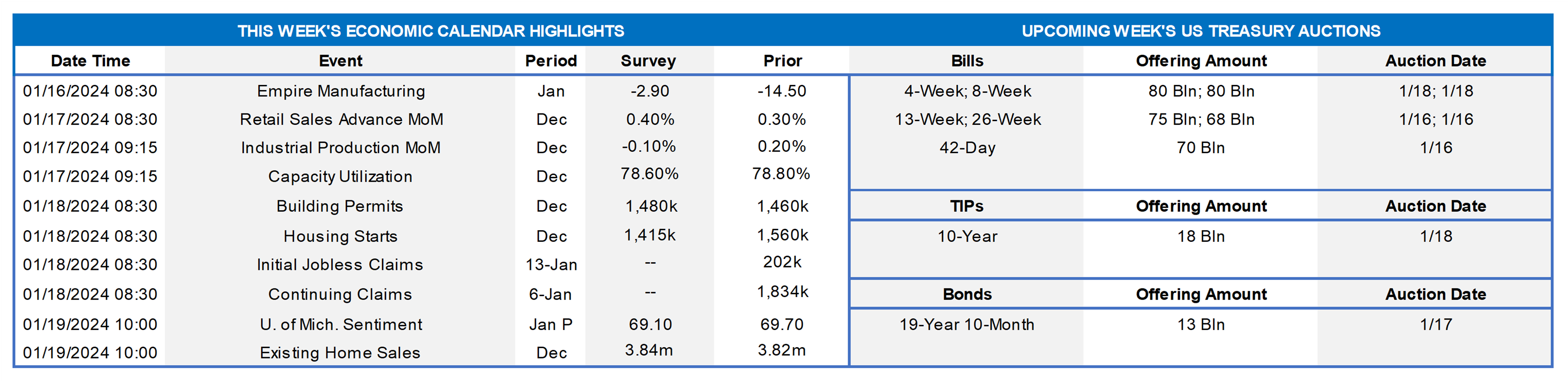 With end-of-year employment and inflation data already released, the market likely will turn to gauging the pace of economic activity during Q4 2023. This week’s reports on retail sales, industrial production and new residential investment activity in December will allow economists to bolster their estimates of real consumer spending and investment outlays during the fall. While real GDP growth is universally expected to slow from the 4.9% annualized clip posted last summer, the range of estimates remains wide, extending from a modest .1% dip to an above-trend 2.5% gain. A quartet of Federal Reserve policymakers, all of whom will be FOMC members in 2024, are scheduled to give their thoughts on the economic outlook and monetary policy.