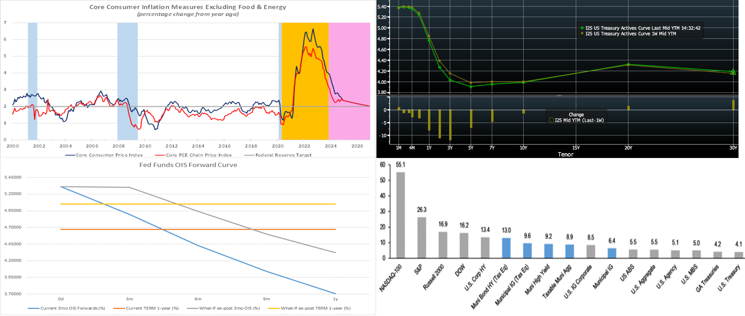 Source: Bloomberg. Top pane is yield (LHS, %), bottom pane is change (LHS, bps). From last Thursday afternoon to this one, the UST curve declined in tenors 10-year-and-under, with shorter tenors in the lead. Much of the move occurred this past Thursday afternoon when, despite CPI being a tad above expectations, the market apparently judged the data as nonetheless consistent with an ongoing disinflation trend. Moreover, a heavy slate of UST auctions was absorbed and now in the rear-view mirror. In terms of market-implied pricing of the Fed, the chance of a 25p cut in March is ~70%, up from ~65% last week. The year-end 2024 forward is ~3.83% which equates to 150 bps of cuts.