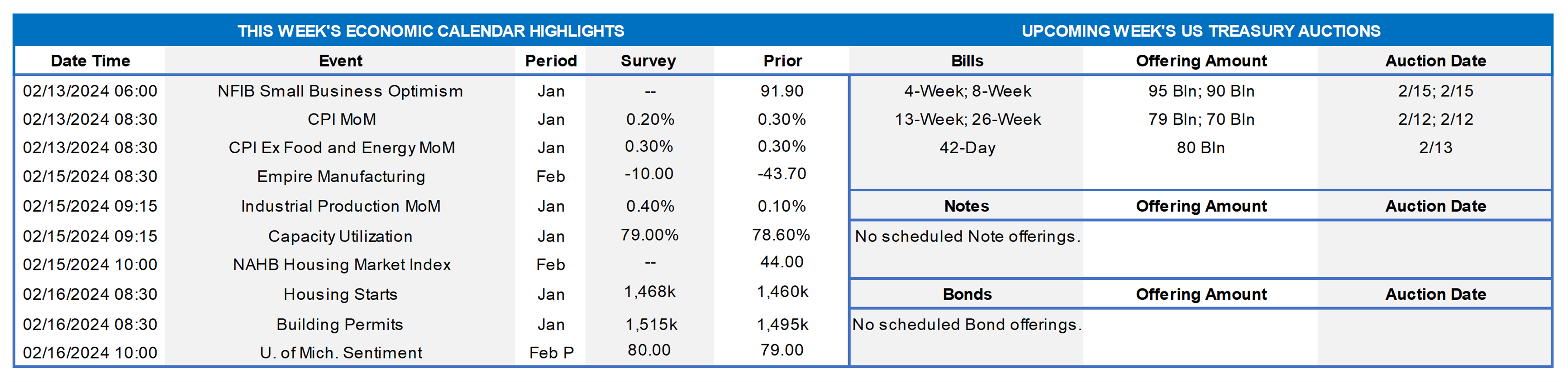 Source: Bloomberg. Top pane is yield (LHS, %), bottom pane is change (LHS, bps). From last Thursday afternoon to this one, the UST curve rose ~7 to 12 bps, with the 2- to 5-year sector leading the way. The main protagonist for the move was Tuesday’s higher-than-anticipated CPI report (details above) which instantly propelled yields higher. Subsequently, yields recovered from the highest levels of the week. Thursday’s weaker-than-expected retail sales report helped in this regard. In terms of market-implied pricing of the Fed, the chance of a 25 bps cut in March is ~7%, down from ~17% a week ago. The year-end 2024 forward is ~4.36%, roughly 21 bps higher than last Thursday. The market prices for a cumulative total of ~98 bps of cuts by the end of 2024, compared to ~118 bps a week ago. The upcoming holiday-shortened week is bereft of high-profile data, but the market will focus on the limited releases and any Fedspeak of note.