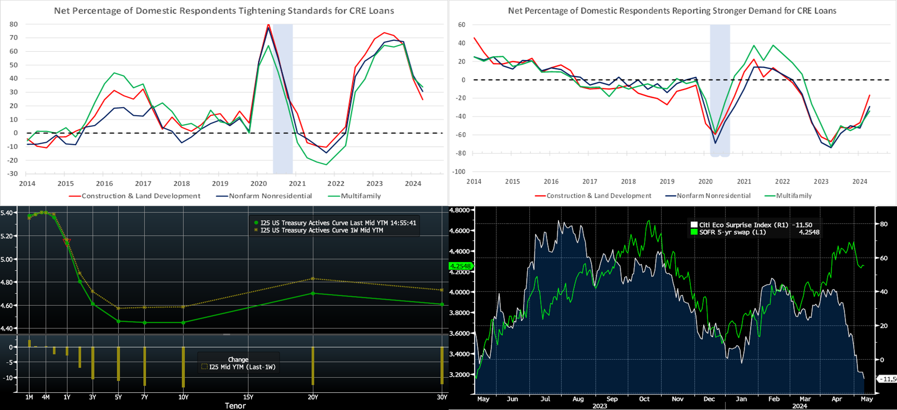 Source: Bloomberg; Citibank. Shown here is the Citibank Economic Surprise Index (RHS, White), which measures data surprises relative to market expectations, with positive readings revealing that data releases have been stronger than market consensus expectations and negative readings revealing that releases have been weaker than expectations. Also charted is the 5-year SOFR swap rate (LHS, Green, %). As seen here, and which makes intuitive sense, rates tend to follow the direction of the Surprise index. After months in positive territory in Q1, the Surprise index has declined since mid-April and even turned negative in early-May, the latter likely a result of weaker-than-expected jobs-related data released in the past week. Moreover, both “soft” (surveys, for instance) and “hard” (actual economic activity) data points have softened. In turn, the 5-year swap has retreated ~24 bps since the end of April. While perhaps this index signals a moderation in data strength and a “topping out” zone for rates, it should be noted that it is a measure of data vs. market consensus expectations; in other words, part of the reason for its recent decline has been attributable to economists having adjusted their forecasts higher.