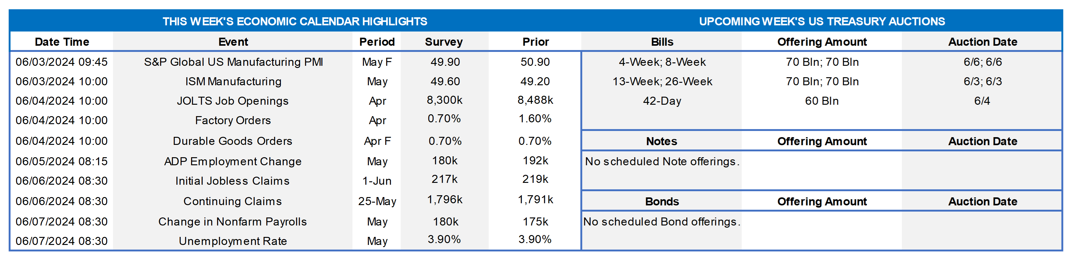 The upcoming week contains a moderately busy economic release calendar, clearly led by the June 7th employment situation report from the Bureau of Labor Statistics (BLS). Recent data has generally been supportive of the “Fed-on-hold” theme, and an ongoing sturdy jobs market has been a pillar in this regard. Therefore, the report will warrant the market’s scrutiny. With the June 11-12 FOMC meeting fast approaching, the Fed will enter blackout mode on speeches/comments, so the economic data should serve as the main catalyst for any rate moves.